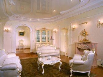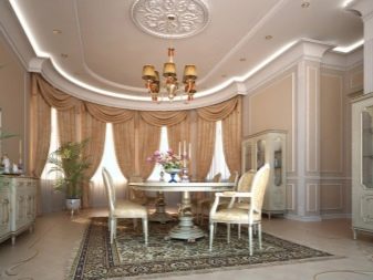 Les structures suspendues de style classique, qui comprennent les styles classique, néoclassique, classique et italien, sont réalisées en mettant l'accent sur la symétrie et les attributs de la solennité du palais. Les constructions en métal et en plastique ne sont pas appropriées ici. Ils ne correspondent absolument pas à l'idée d'une décoration formelle mettant l'accent sur le luxe. Les matériaux à texture mate sont prioritaires, mais avec une approche habile, les contrastes des deux textures (mate et brillante) sont magnifiques ici.