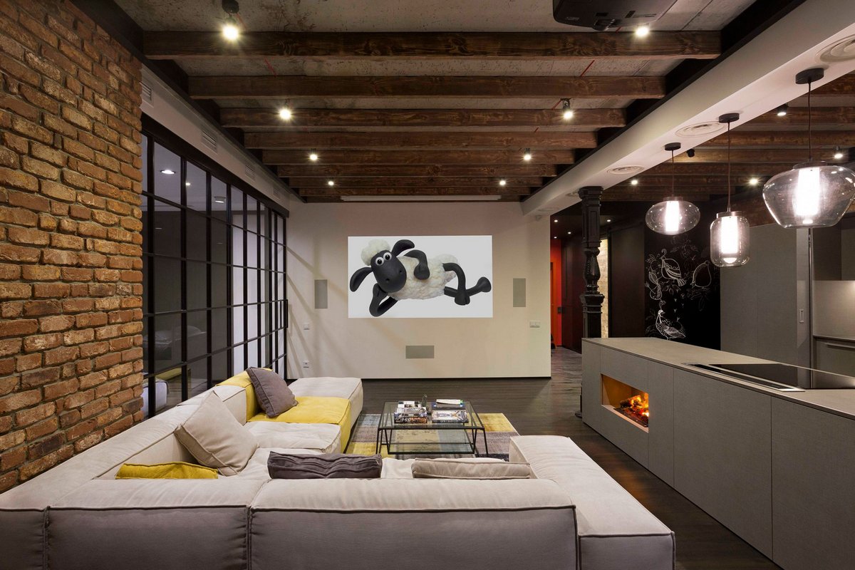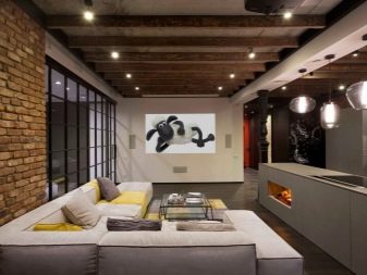 Pour les styles loft et grunge, des motifs délibérément grossiers sont préférables. Dans ce cas, le ton du revêtement devrait être principalement uniforme. Les plafonds sont décorés avec des poutres et des systèmes de communication.Des dispositifs d'éclairage inhabituels à la quantité de plusieurs pièces sont utilisés comme rétro-éclairage. En plus de la tache réglable. il peut s'agir de lustres de forme grossière.