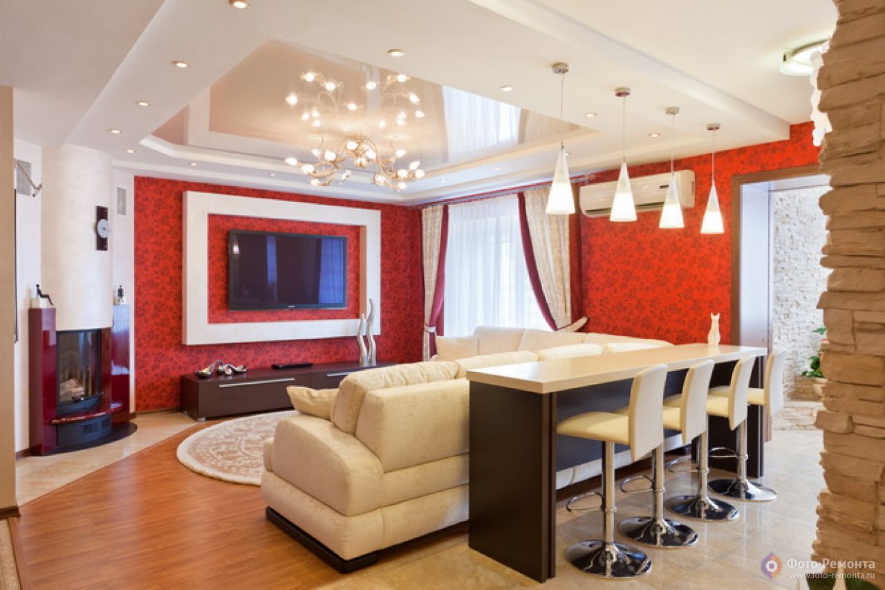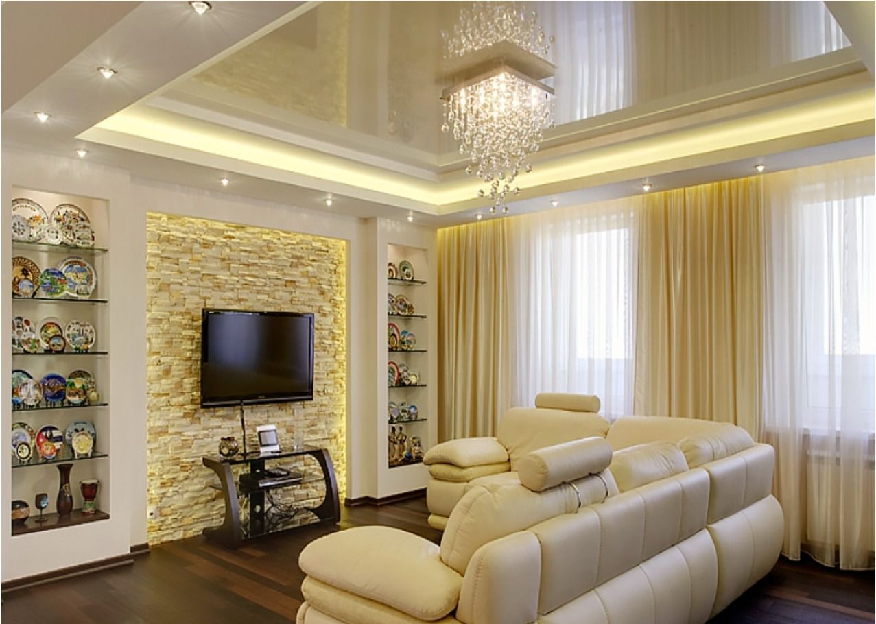 Cette pièce est la pièce principale de la maison. Son design doit donc être spécial et mémorable. La priorité est les couleurs chaudes, légères et riches, leur combinaison avec le blanc. La conception peut être différente, mais les conceptions à un seul niveau auront l'air simple. Il est important d'ajouter une texture satinée et brillante et des lampes élégantes. Les plafonds tendus avec éclairage intérieur sont appropriés.