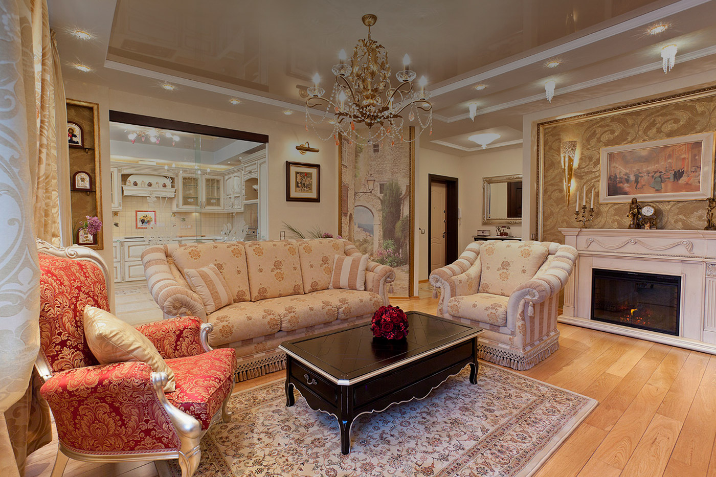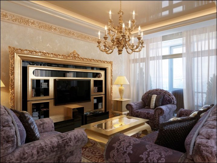 La lampe principale est un magnifique lustre avec beaucoup de petites lampes lumineuses. Imitation obligatoire du stuc en plâtre et présence d'or dans le décor. En élaborant la composition, vous pouvez vous appuyer sur le décor du mobilier en sélectionnant des éléments similaires sculptés ou tordus.