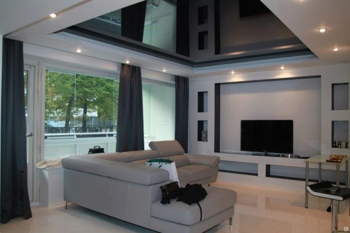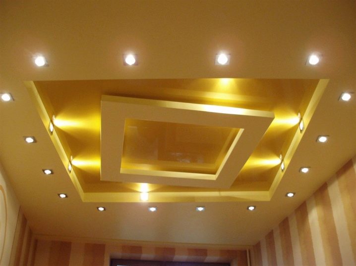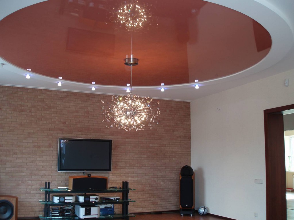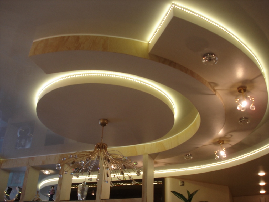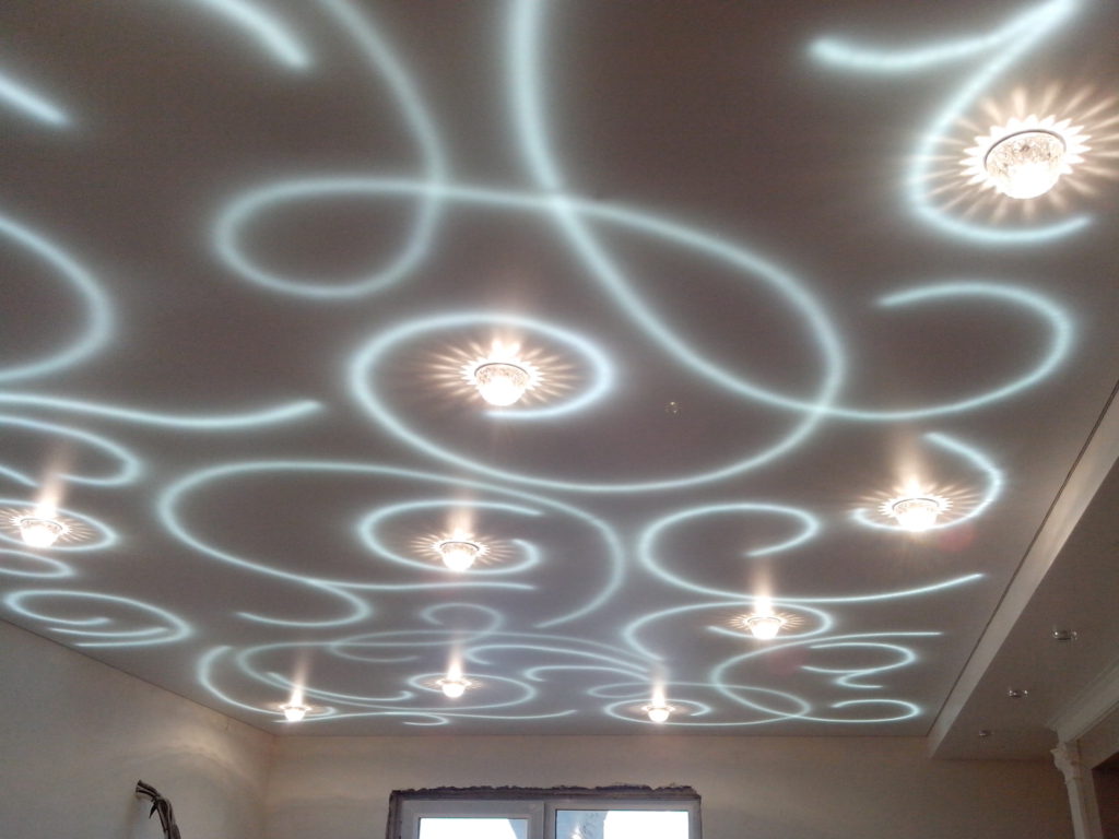 Pour éviter cela, les concepteurs ont proposé un éclairage intégré sous forme de projecteurs, ainsi que des spots permettant de régler l'angle de la lumière.Installés à intervalles réguliers autour du périmètre, ils sont en mesure de remplir intégralement l’éclairage central. Pour cette raison, la conception d'un faux plafond se fait souvent sans lustres.