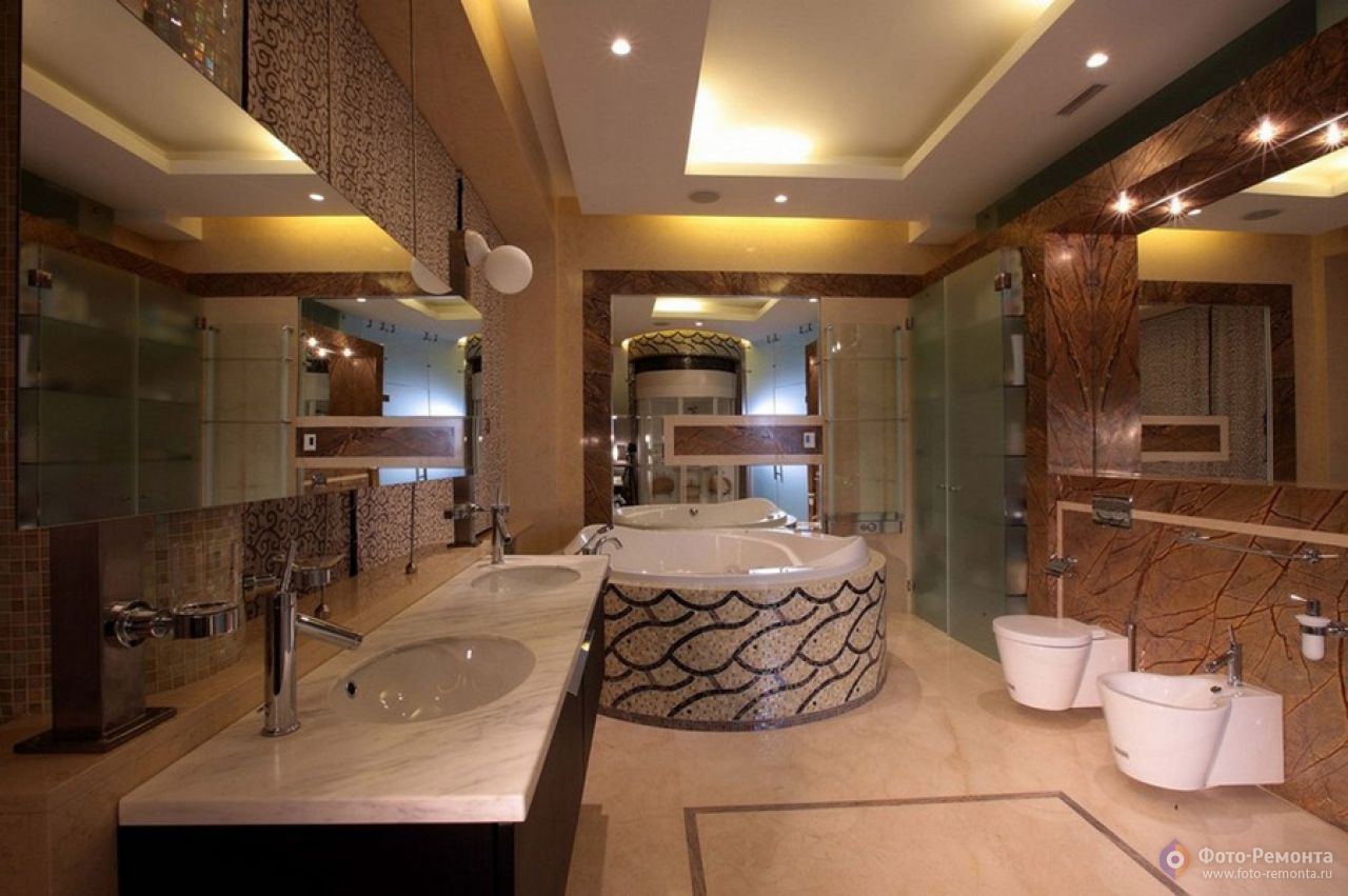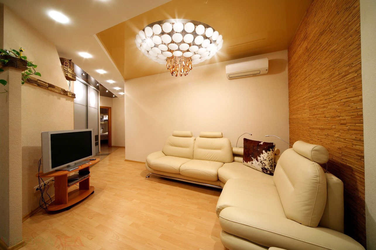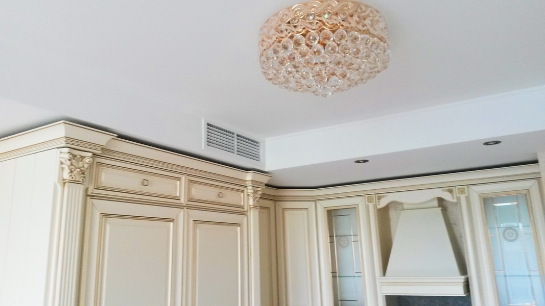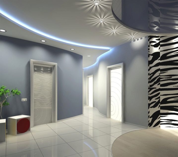 Pour éviter cela, les concepteurs ont proposé un éclairage intégré sous forme de projecteurs, ainsi que des spots permettant de régler l'angle de la lumière.Installés à intervalles réguliers autour du périmètre, ils sont en mesure de remplir intégralement l’éclairage central. Pour cette raison, la conception d'un faux plafond se fait souvent sans lustres.