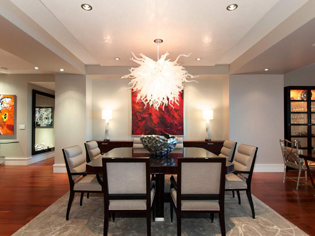 La géométrie est la bienvenue, incorporant des lampes au-dessus de la salle à manger.