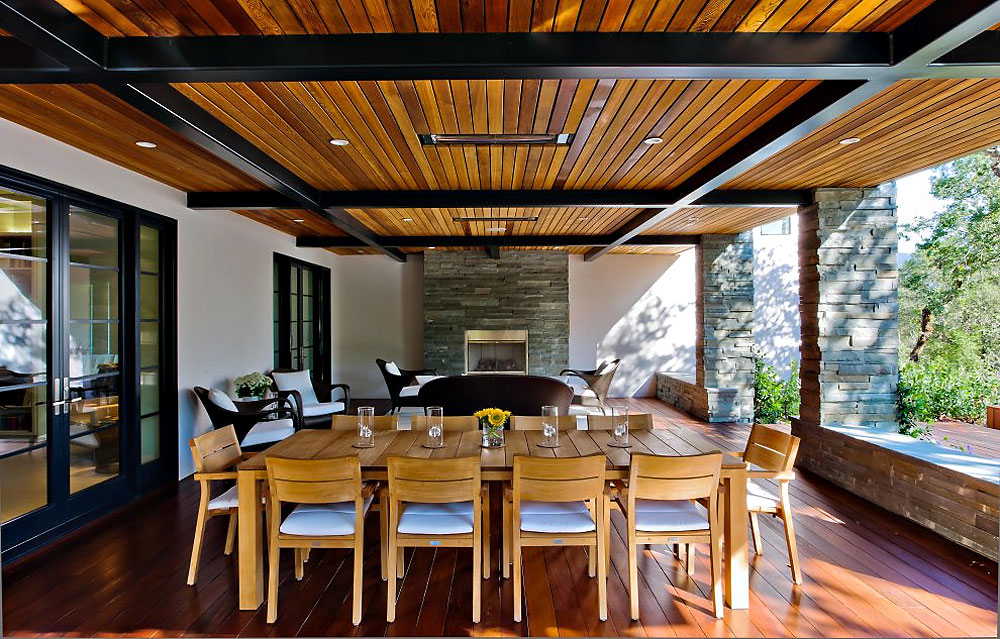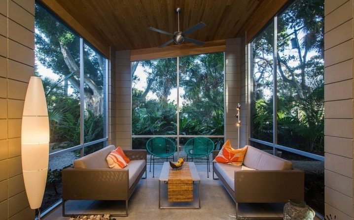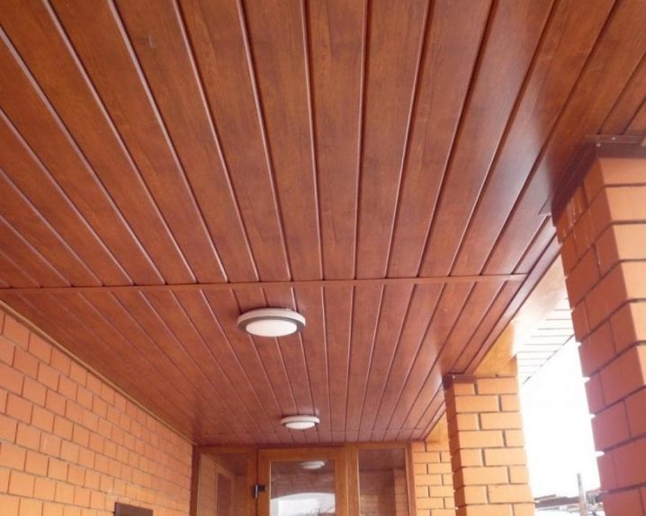 En installant la structure suspendue sur la véranda d'une maison privée, le matériau et la couleur sont sélectionnés en fonction du style. Vous pouvez choisir des cassettes en bois, des lattes pour un tableau de la nuance désirée (jusqu’à peindre à la lumière). Si la véranda est fermée, vous pouvez la décorer avec des cloisons sèches. Cela vaut la peine de faire un pari sur la texture du bois.