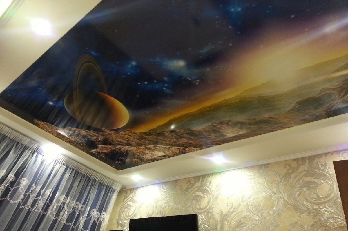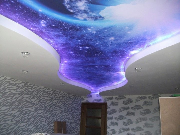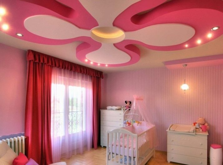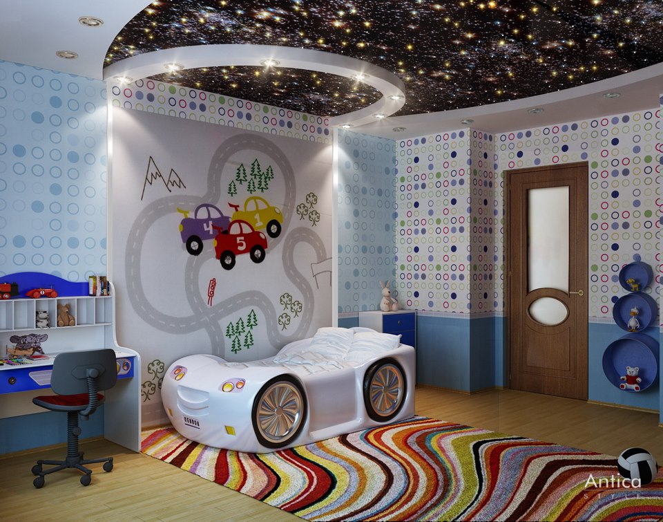 L'intérieur de la chambre d'un enfant dépend de son âge et de son sexe. Plus souvent, le plafond est décoré avec un film étirable sous la forme d'un revêtement solide ou d'un insert séparé. Les teintes sont sélectionnées douces: elles ne doivent pas irriter les yeux.