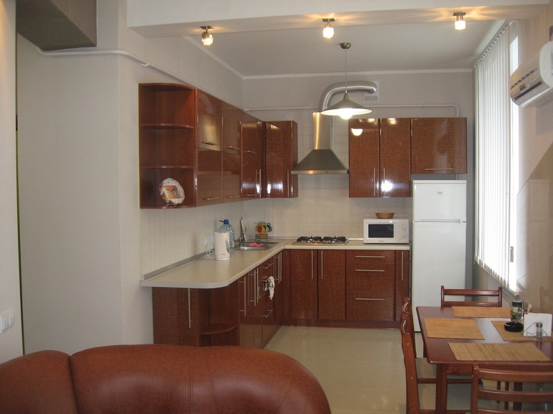 C’est un endroit où la dynamique et la combinaison des contrastes de couleurs sont les bienvenues. Par exemple, vous pouvez utiliser du blanc avec du jaune, du vert. La combinaison des tons de gris clair et de vin sera magnifique. En même temps, pour un contraste lumineux, une certaine zone est allouée (par exemple, au-dessus d’un compteur ou d’un évier).