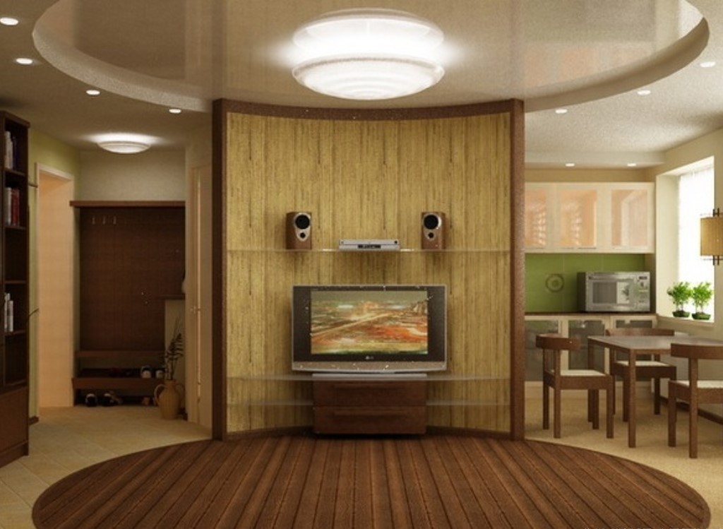 Regardez admirablement les inserts du plafond tendu autour du lustre.Il s’agit généralement d’accents ronds d’un diamètre de 2,5 à 3 m. En raison de l’encadrement en forme d’élément en placoplâtre, leur diamètre peut augmenter de 20 à 30 cm de diamètre. triangle aigu avec apex à la porte d'entrée du couloir.