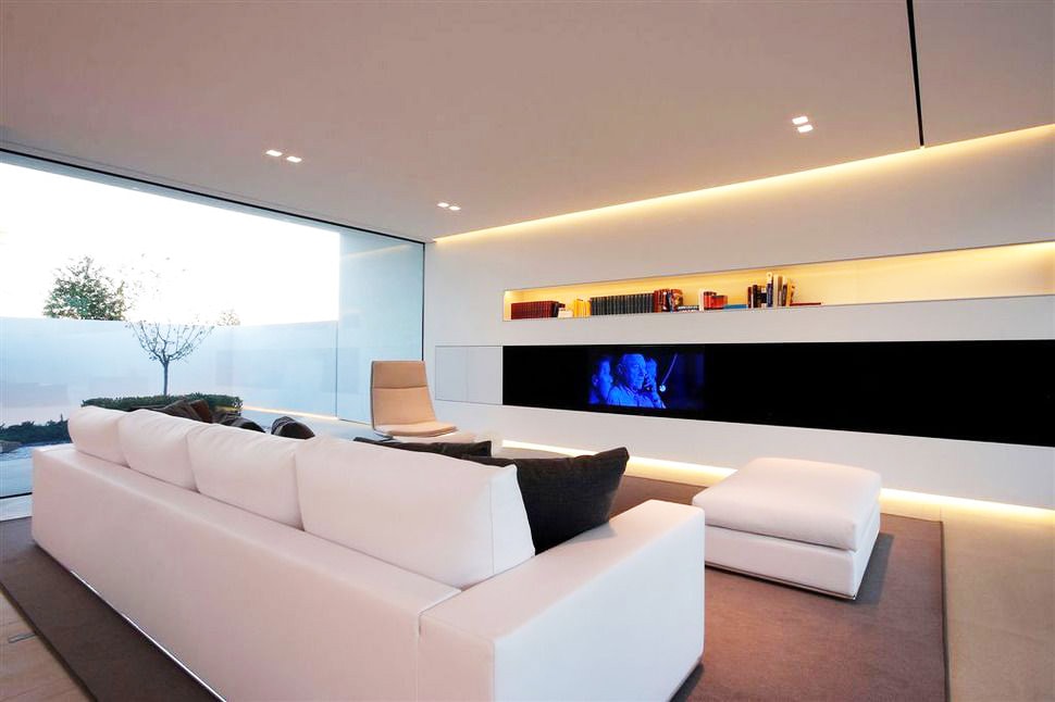 - Utilisation plastique dans les compositions intérieures modernes. Choisissez des revêtements à faible réflectivité ou à texture mate. Adoucissez-le avec des cloisons sèches.
