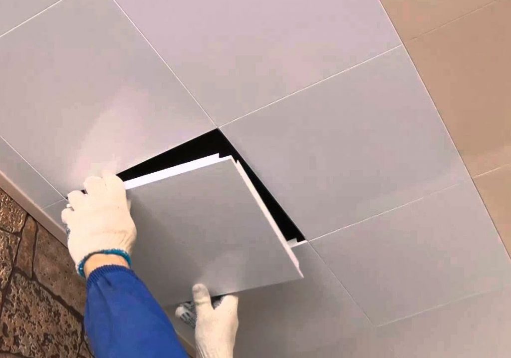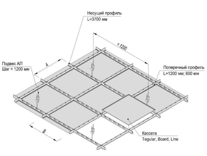 Les variétés de plafonds suspendus (carrelés) tirent leur nom des cassettes - plaques suspendues carrées, qui ont été conçues par les Français. Typiquement, la cassette est une plaque de 30x30 à 90x90 cm, en plastique ou en métal (acier galvanisé, aluminium). Variétés galvanisées revêtues de peinture en poudre spéciale.Les cassettes en aluminium sont traitées avec un revêtement bimétallique ou polies: elles ont ainsi une lueur de miroir.