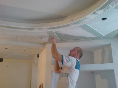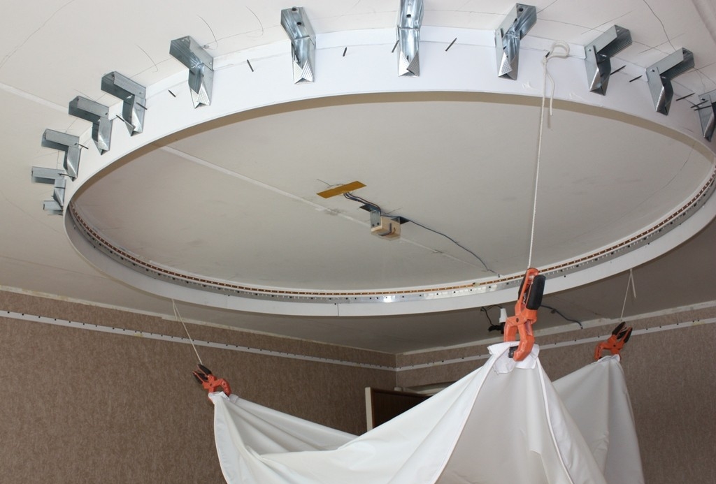 Des conceptions sophistiquées nécessitent des calculs précis. Il n'y a pas assez de croquis approximatif. Il est nécessaire de transférer le schéma au plafond avec précision, en observant chaque pli et point de fixation des éléments du cadre. Si nous considérons qu'elles diffèrent souvent par leur taille importante, il sera difficile de gérer l'installation seule.