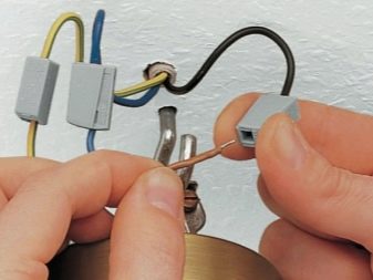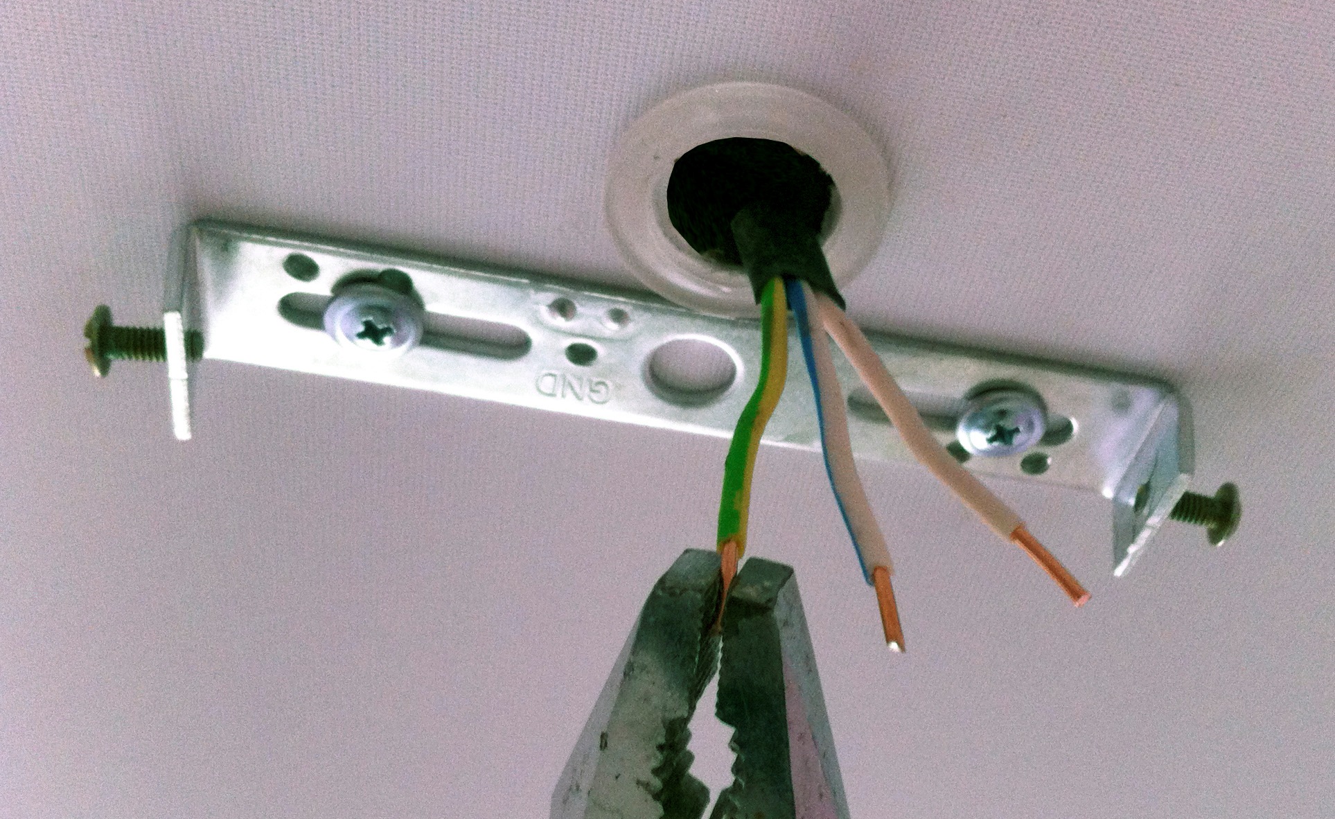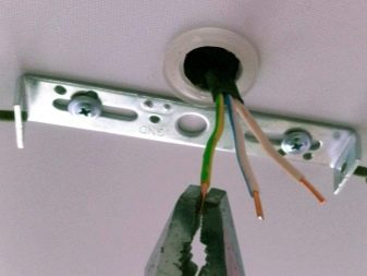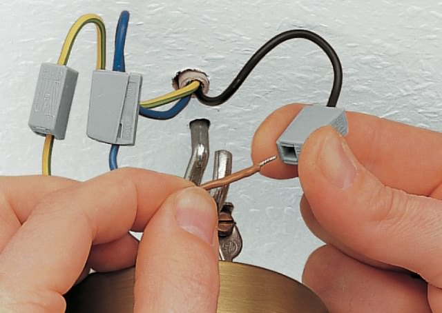 Monter projecteur ou lustreTout d’abord, il est nécessaire de retirer le câblage du trou reçu et de nettoyer son extrémité pour laquelle vous utilisez une pince à bec effilé. Ensuite, le terminal de connexion est usé et le câblage du lustre ou du projecteur est connecté.