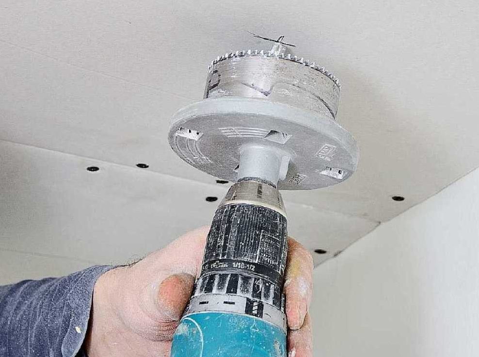 Une fois les plaques de plâtre terminées, vérifiez à nouveau la position correcte des appareils d'éclairage. Les trous sont percés au moyen de buses spéciales sur la perceuse (scie trépan). Pour créer des trous pour les lampes, prenez une scie dont le diamètre coïncide avec le diamètre du trou.