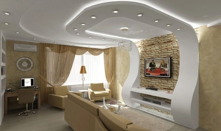 Cloison sèche - l'un des matériaux de construction les plus populaires pour ce type de travail. Il va parfaitement faire face à la surface inégale du plafond, cacher tous ses défauts. Pour ceux qui aiment la conception originale, des plafonds à plusieurs niveaux adaptés avec des éléments décoratifs et des transitions douces. Un éclairage intégré créera une atmosphère confortable et chaleureuse dans la pièce.