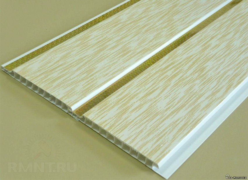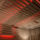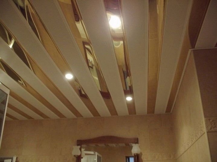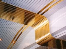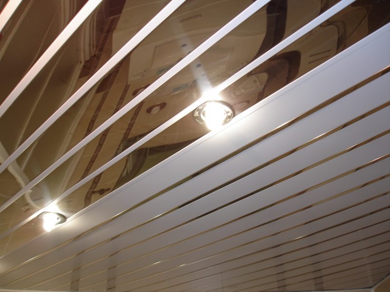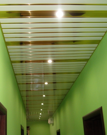 Les inserts entre les lattes peuvent être réalisés dans la même couleur que les lattes elles-mêmes ou en contraste.Si les lattes elles-mêmes sont mates et monophoniques, les profils de décoration imitent des métaux précieux, tels que l’or. Cela donne immédiatement à la pièce un aspect élégant et le plafond lui-même a l'air cher.
