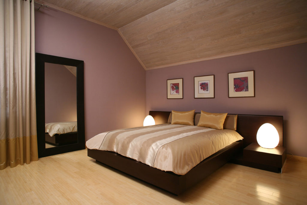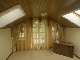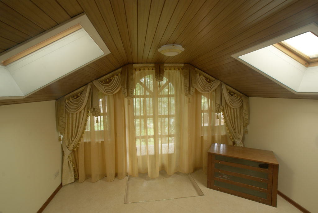 La finition des plafonds de grenier a l’air très inhabituel: il s’avère que le plafond monte en vagues d’un haut biseau à un haut.