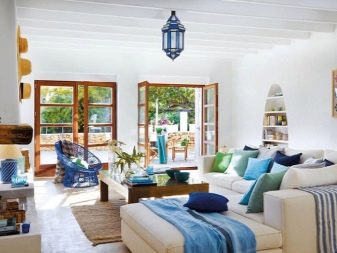 - Méditerranée. Le plafond des rails devrait ressembler aux planches du navire. Il n’est pas interdit s’il aura l’air légèrement vieilli. Peu importe le matériau des lamelles - PVC, métal ou bois.L'essentiel est la fiabilité maximale de l'exécution. La couleur doit être choisie principalement blanche, mais vous pouvez utiliser des nuances plus chaudes ou plus froides, par exemple champagne, blanc cendré, etc.