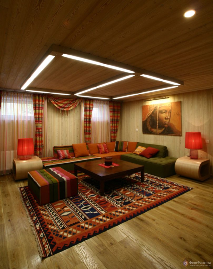 - Scandinave. Ici, le plafond des rails doit être en bois et blanc. Il devrait sembler que les planches ont brûlé au soleil, ont été blanchies de manière naturelle et non par la peinture ou des méthodes artificielles.Il s’ensuivra alors une véritable recréation de l’atmosphère scandinave, tout en dissimulant intelligemment toutes les communications dans la niche située entre le plafond et la surface du rack.