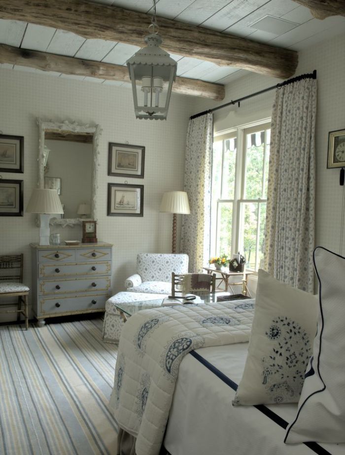 - La provence. Le style de la province française s’harmonise parfaitement avec les structures des rails, surtout s’ils sont en bois et vieillis artificiellement. La couleur doit être douce et claire: crème, vert clair, rose pâle. Le plafond ne doit pas être alimenté en blanc, car cette teinte ne se trouve pratiquement pas dans la nature de la Provence. Il est préférable de choisir des couleurs légèrement «diluées» pour ajouter à la pièce l'atmosphère souhaitée.