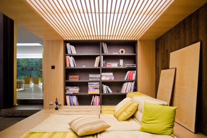 Cela a l'air bien si dans le salon un plafond en plâtre ordinaire est combiné avec une latte inhabituelle. Dans ce cas, il a contribué à la zone studio, séparant le coin salon de la salle à manger. Souvent, le plafond du rack accentue les détails, comme dans cet exemple.