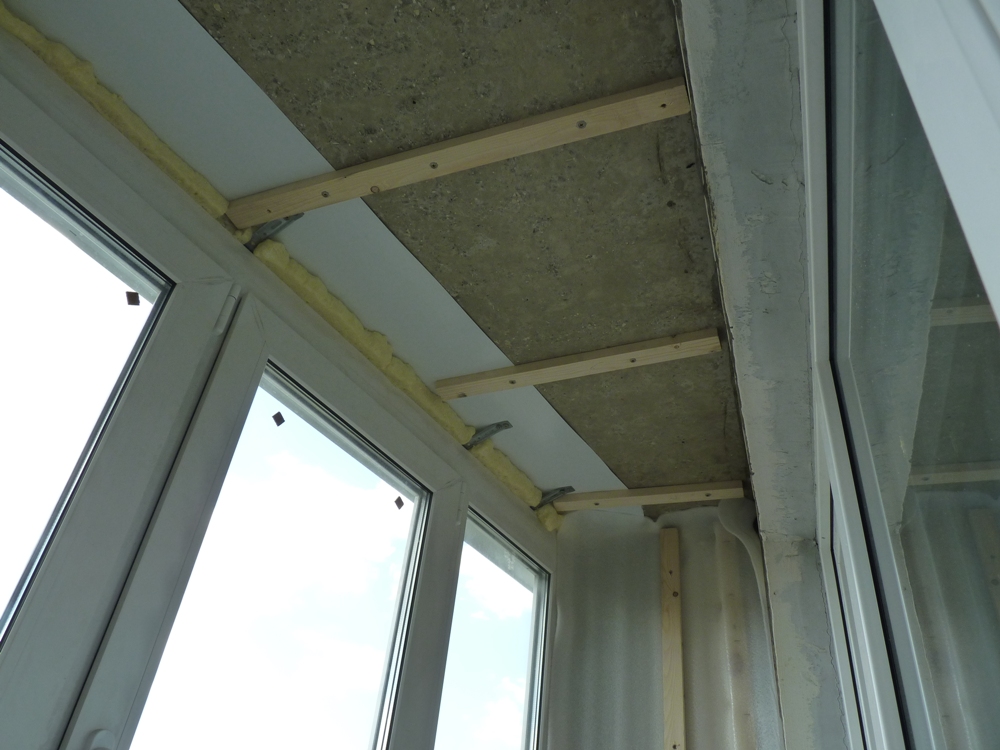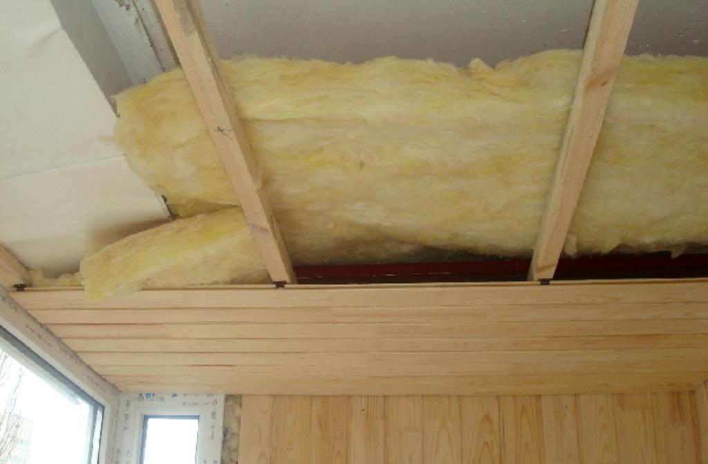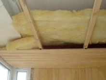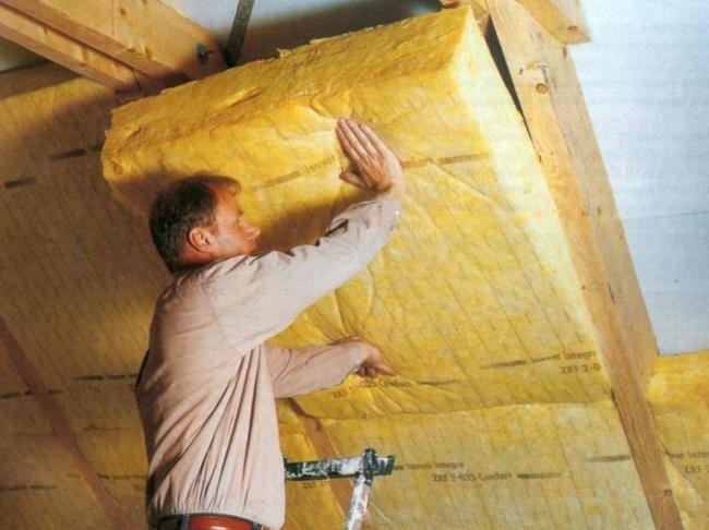 Entre les lattes doit rester un pas égal à la largeur de l'isolation (environ 1-2 mm). Après cela, entre la caisse, vous devez effectuer la pose d'un revêtement chauffant. Il devrait entrer aux bons endroits avec un petit effort. Pour que l’isolation reste chaude au plafond, fixez-la à l’aide de chevilles..
