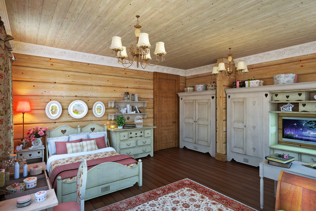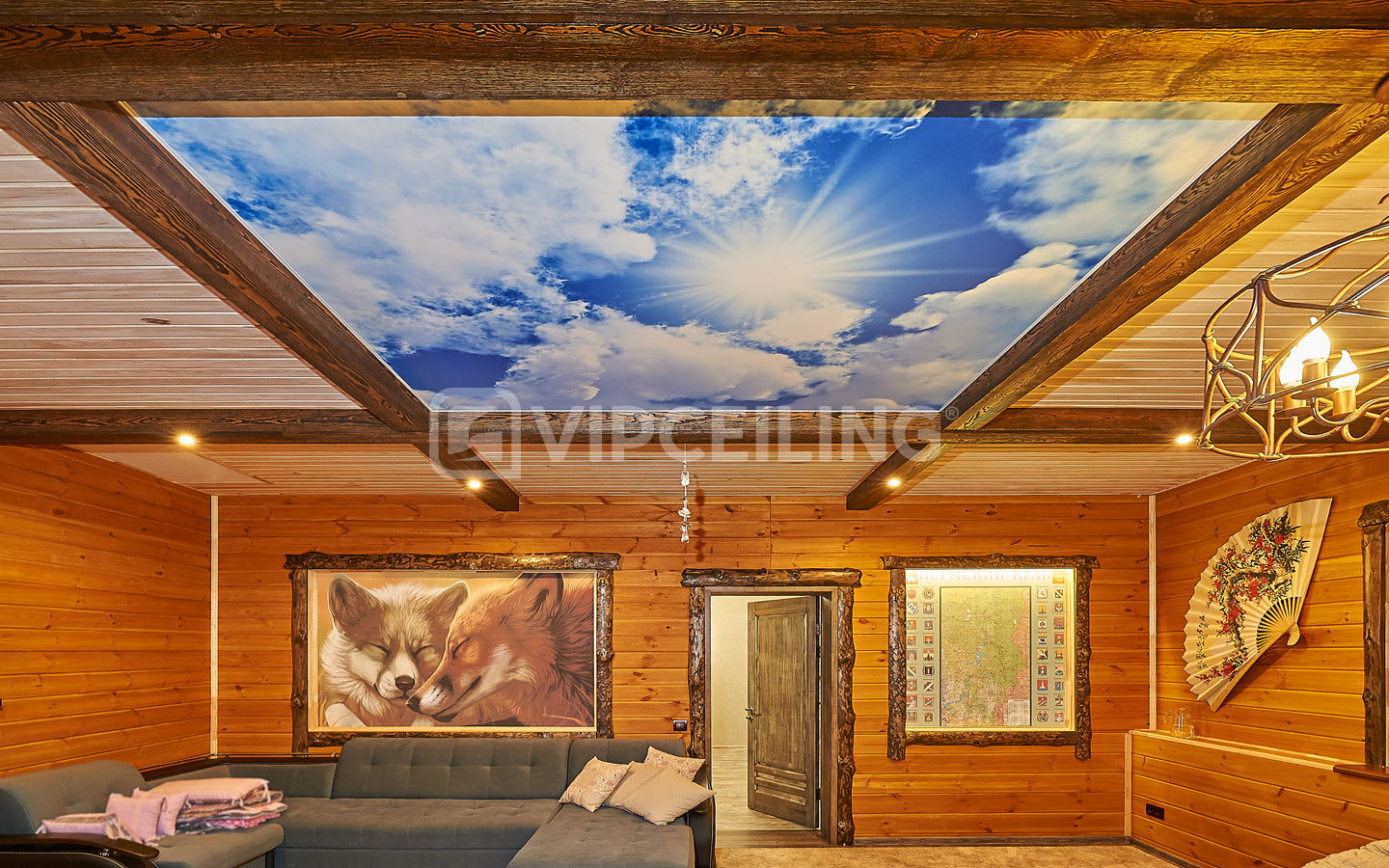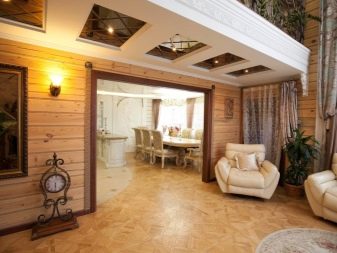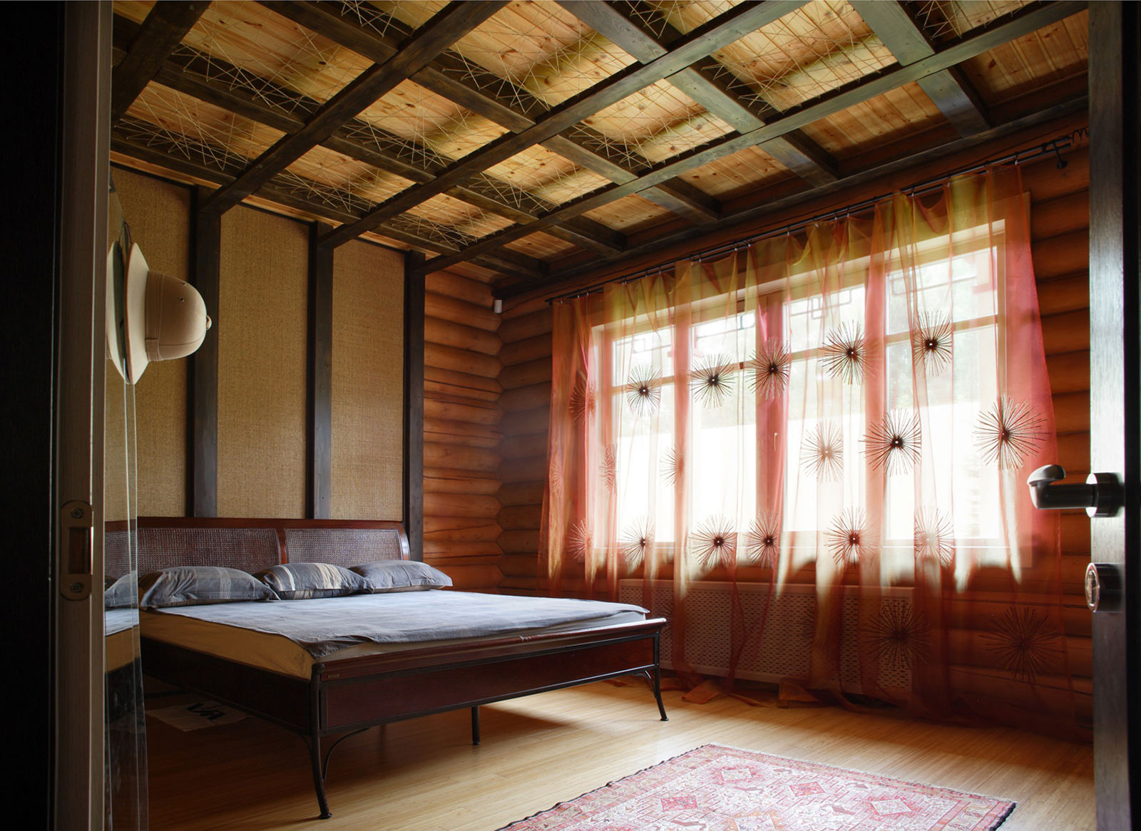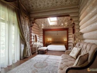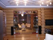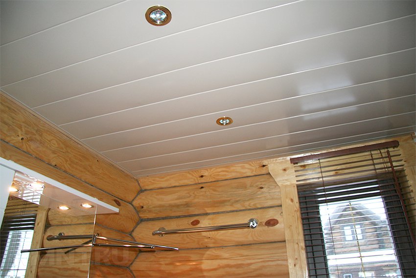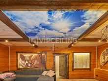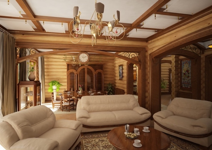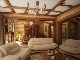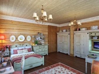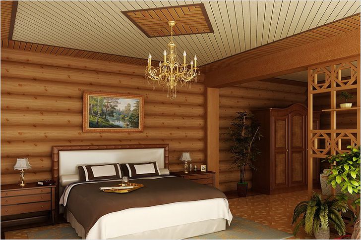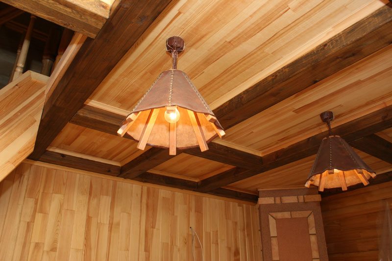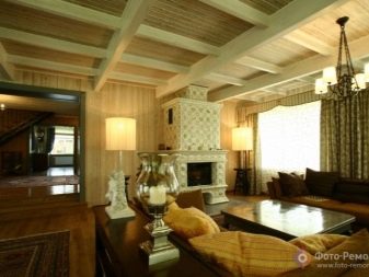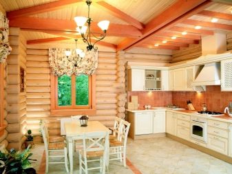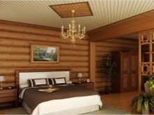 - Parfois, les options de revêtement synthétique sont également choisies pour le plafond dans une maison en bois. - par exemple, des panneaux en plastique ou des plafonds tendus. En outre, si les murs sont garnis de bois, placez au moins de petits éléments décoratifs en bois sur un tel plafond, par exemple des poutres. Les lustres et les lampes en bois correspondent à la couleur des murs.