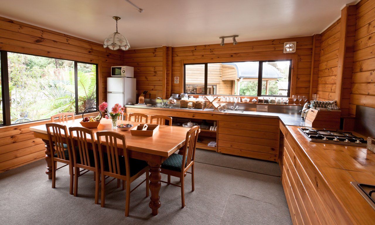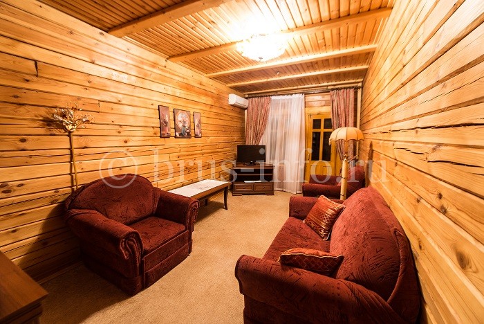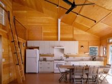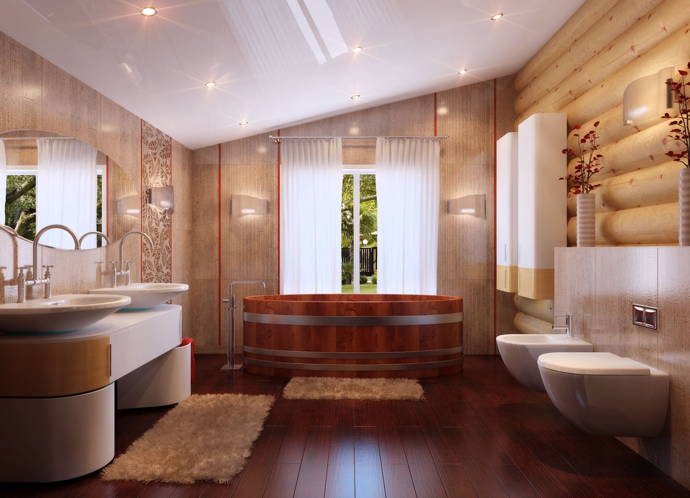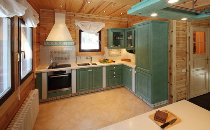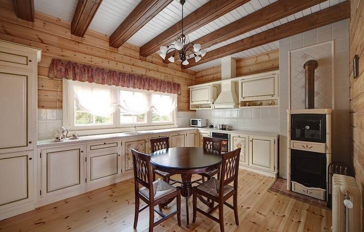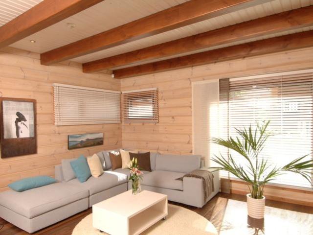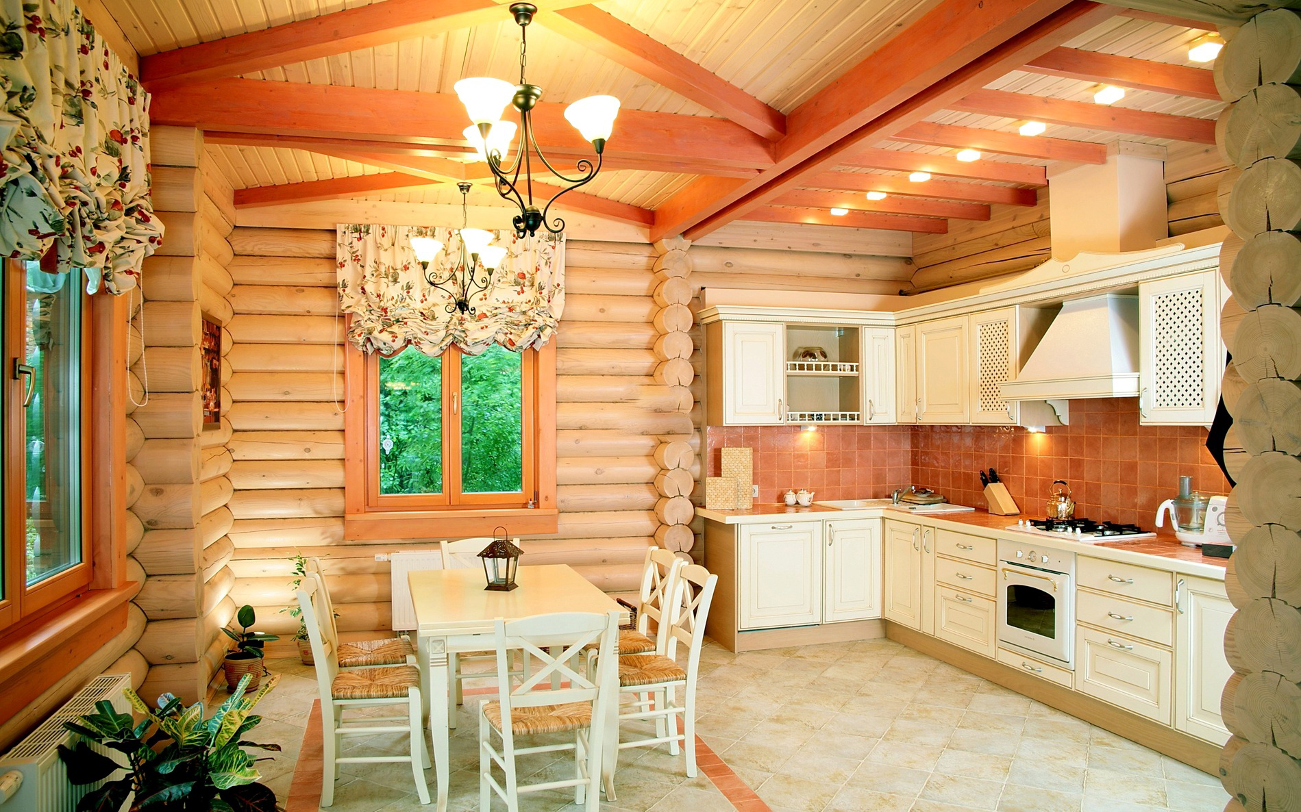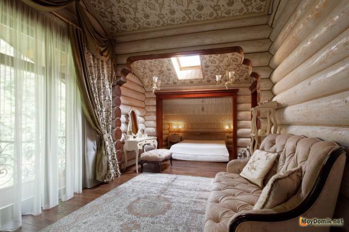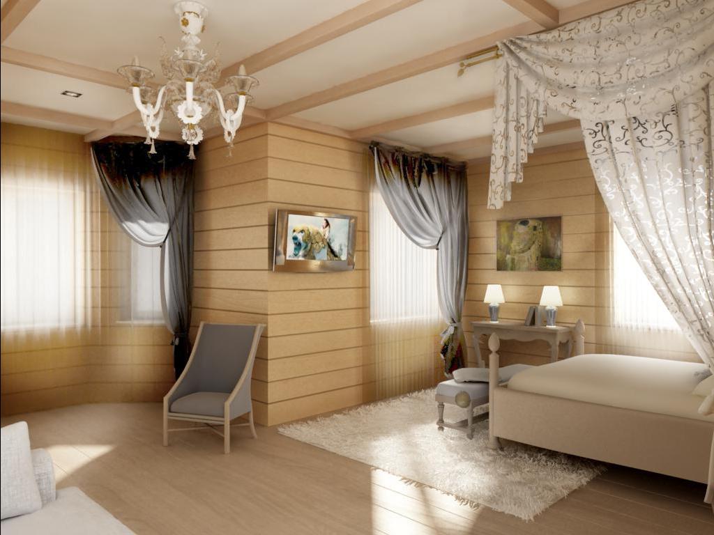 - Parfois, les options de revêtement synthétique sont également choisies pour le plafond dans une maison en bois. - par exemple, des panneaux en plastique ou des plafonds tendus. En outre, si les murs sont garnis de bois, placez au moins de petits éléments décoratifs en bois sur un tel plafond, par exemple des poutres. Les lustres et les lampes en bois correspondent à la couleur des murs.