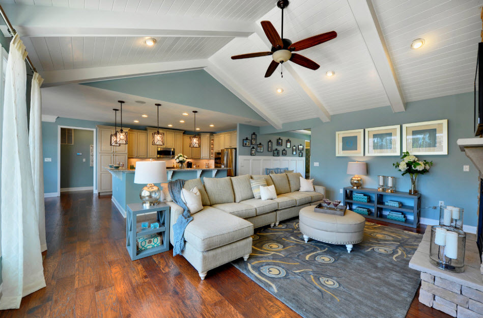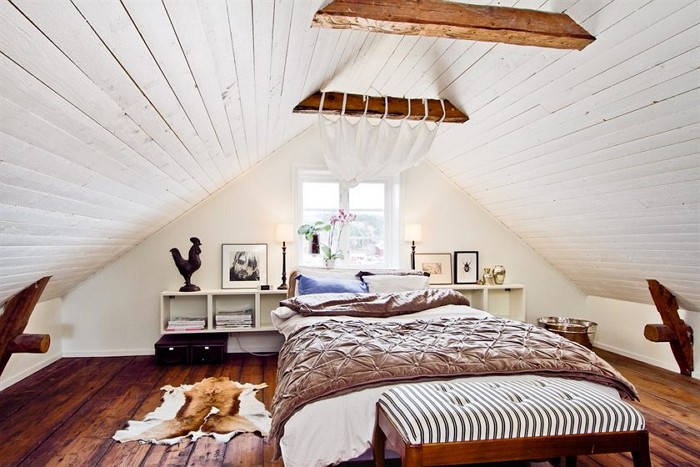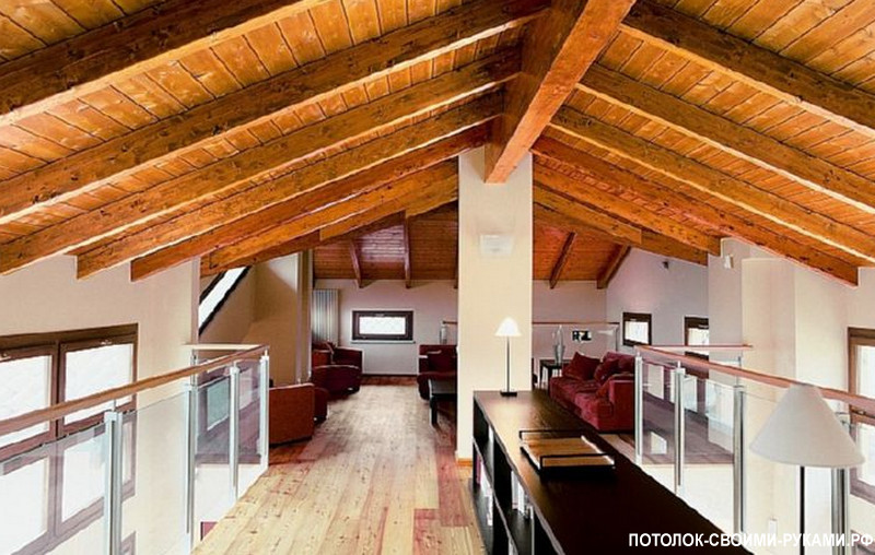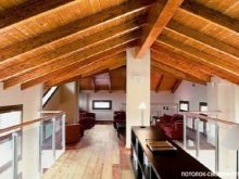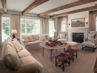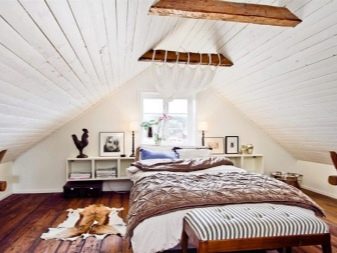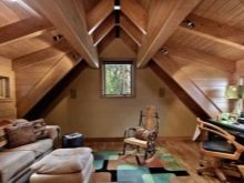 La conception avec des poutres d'imitation est très souvent choisie pour le grenier, mais de telles options conviennent aux premier et deuxième étages. Faire des faisceaux semble inhabituel, et surtout, les conceptions sont extrêmement diverses. Les poutres peuvent être disposées en parallèle, en travers ou même à l'aide des armatures qui serviront à la division visuelle de l'espace dans la pièce.