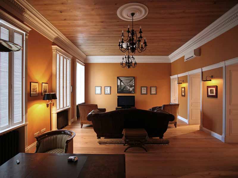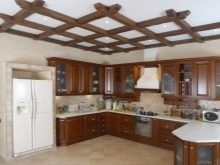 - Le plafond en bois laisse beaucoup de place pour une décoration variée. Par exemple, les panneaux ou les doublures peuvent être peints, vous pouvez les décorer avec des ornements sculptés ou vieillis artificiellement avec des colorants spéciaux. Enfin, dans les intérieurs de style champêtre, les poutres décoratives sont très populaires dans les maisons privées. Il s’agit de constructions en bois clair et en plastique pouvant être installées partout dans le plafond ou à des endroits spécifiques. Les poutres vous permettent de placer des accents et de distinguer visuellement l'espace.