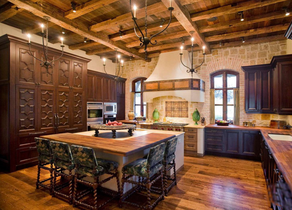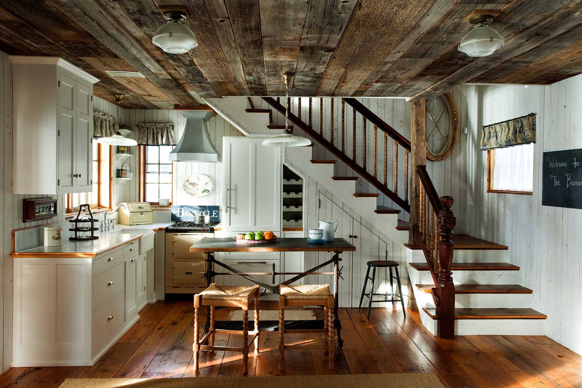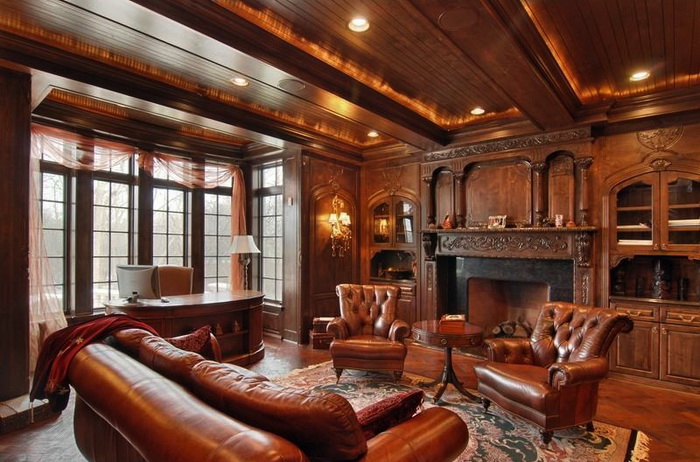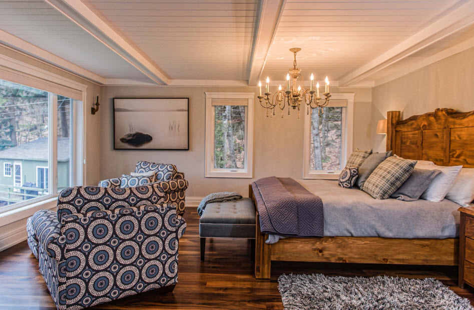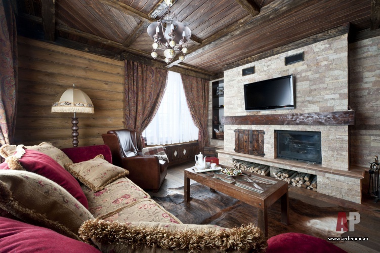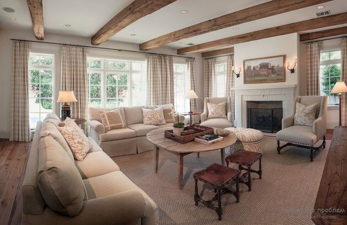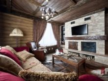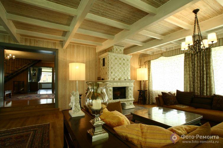 Pour la conception de la salle dans le style de pays devrait être limité à la finition avec un bar ou des conseils. Le style du chalet, typique des villages alpins, est caractérisé par des plafonds en pente avec poutres apparentes. Si vous voulez un intérieur de style russe, pensez aux décorations sculptées au plafond. Il est possible de combiner du bois avec des planches ordinaires, de laisser certaines planches de couleur naturelle et d'autres de peindre - tout cela ne fera qu'ajouter de la diversité à votre intérieur.