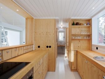 Si vous préférez un design laconique moderne, vous pouvez facilement incarner des idées inattendues dans une maison en bois. Il semble très intéressant combinaison de bois sombre et clair, des planches vieillies, une combinaison de bois avec du plastique brillant ou avec des structures en métal. Les poutres peuvent être une solution universelle pour un tel intérieur, et vous pouvez mettre en valeur les spécificités de la conception à l'aide de l'éclairage.