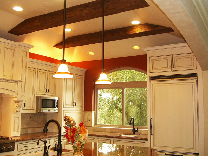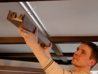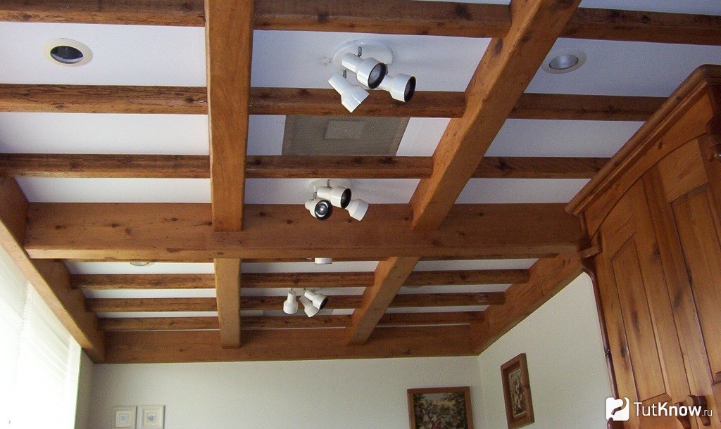 Lors de l’installation automatique de poutres, il est utile de mesurer clairement votre plafond et de tenir compte des éventuelles irrégularités ou défauts créés lors de l’ébauche. Les poutres doivent être alignées de manière à être strictement parallèles. En raison du fait que les falshbalki décoratifs se vident à l'intérieur et sont assez légers, cela ne sera pas difficile: vous pouvez placer les poutres sur un plafond régulier et sur le plafond en pente du grenier. Les chevauchements sont généralement masqués par des poutres transversales ou forment des joints denses avec un meulage ultérieur. Mais si vous voulez faire l'éclairage intégré, il est préférable de faire appel à un électricien.