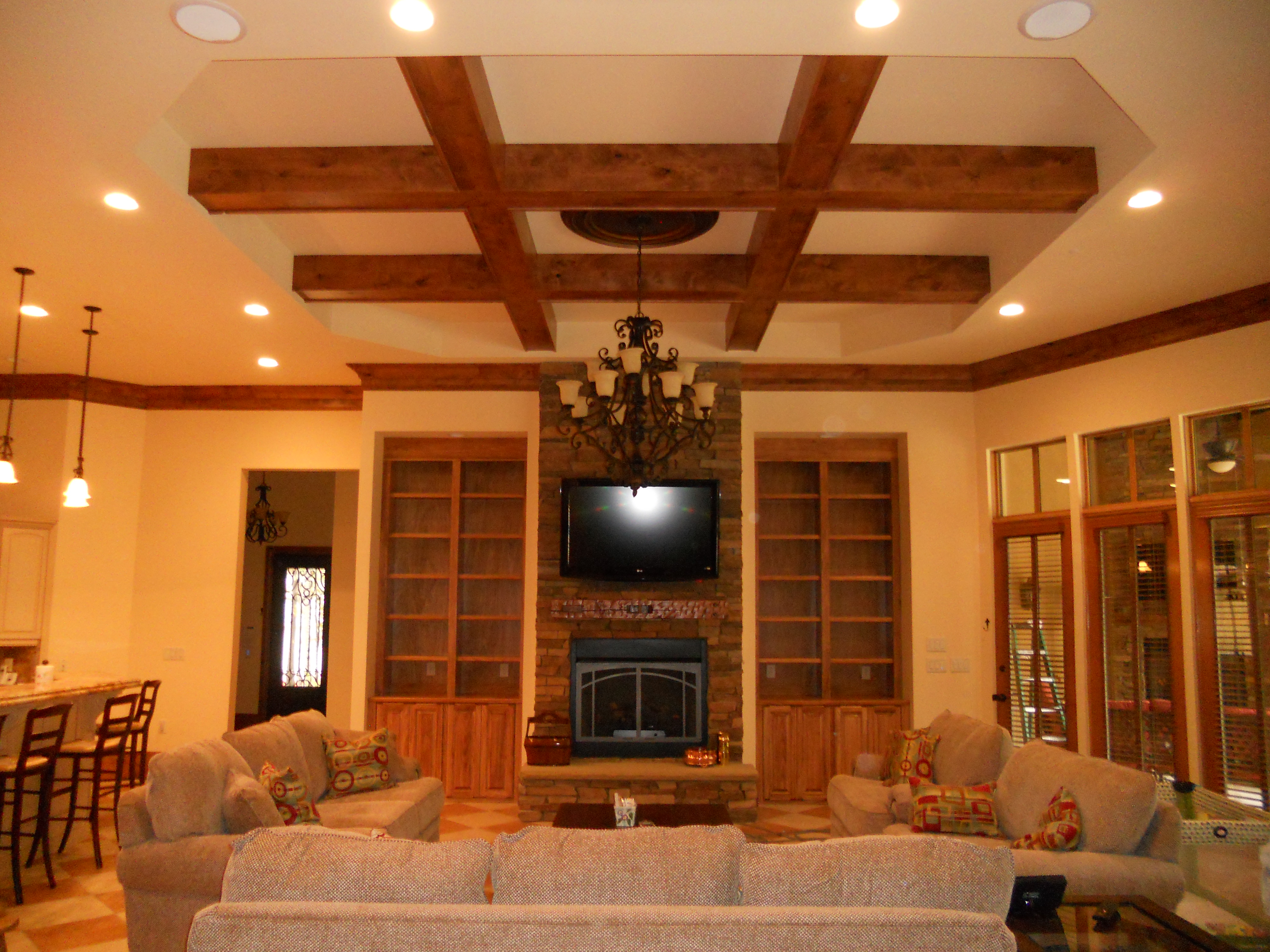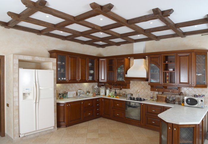 Les plafonds suspendus au design intéressant et les lampes encastrées, qui ne retiennent presque pas l'œil, peuvent être combinés avec succès avec des éléments de décoration en bois. Par exemple, plusieurs poutres décoratives, qui coïncident avec la couleur des meubles, peuvent devenir un élément de design final peu visible et permettent de mettre en valeur le centre sémantique dans une pièce spacieuse comportant plusieurs zones.