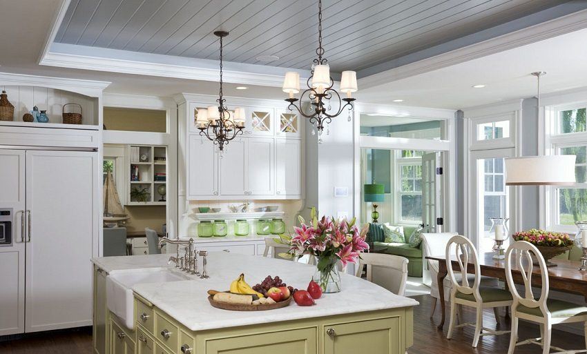 Pour la décoration de la pièce dans le style provençal, le bois peint convient le mieux - le plus souvent, il est blanchâtre, bien que d’autres couleurs pastel puissent également être envisagées: par exemple, le beige, le rose pâle ou le bleu peuvent être superbes. Parfois, tout le plafond est garni d'un tel revêtement de bois - c'est parfait pour cela. En outre, vous pouvez vous limiter aux poutres décoratives si vous les décorez avec un plafond peint en blanc ordinaire ou une structure tendue.
