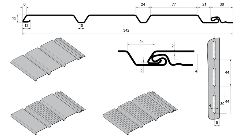 Panneaux spéciaux utilisés pour le revêtement de surfaces horizontales, généralement pour limer les gouttières des gouttières. Ils sont pleins et entièrement perforés, ainsi qu’une perforation seulement dans la partie centrale.En raison de la perforation de la façade reçoit une ventilation supplémentaire.