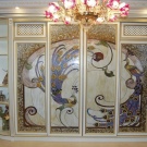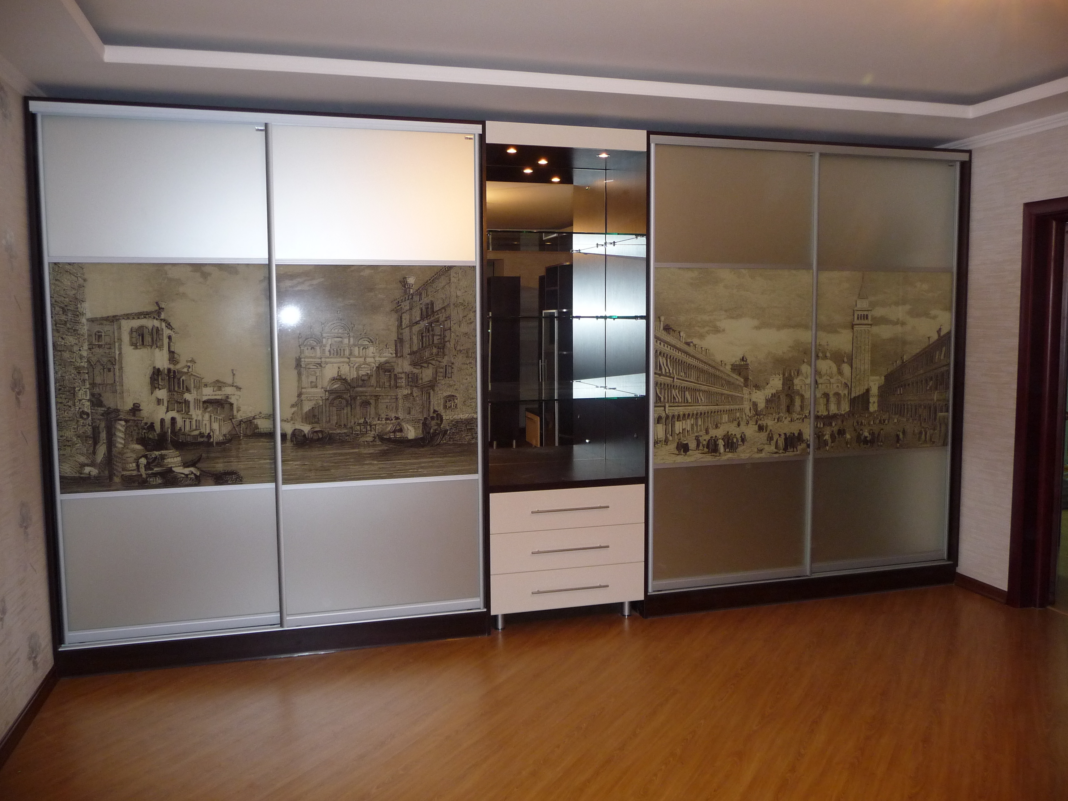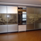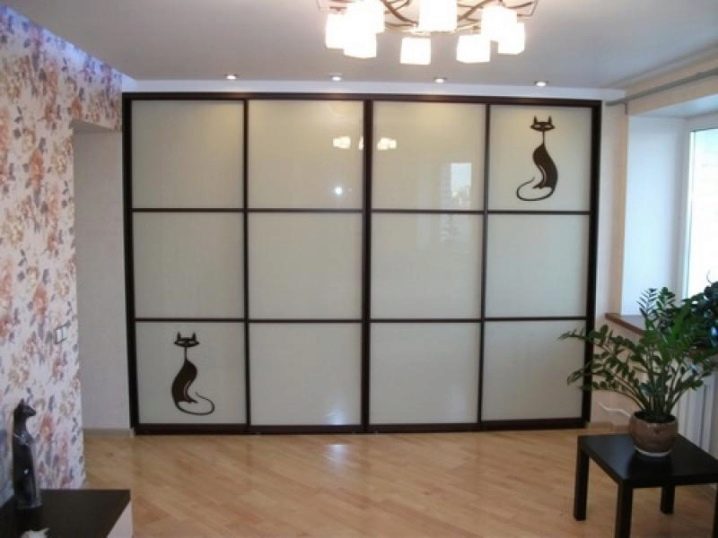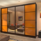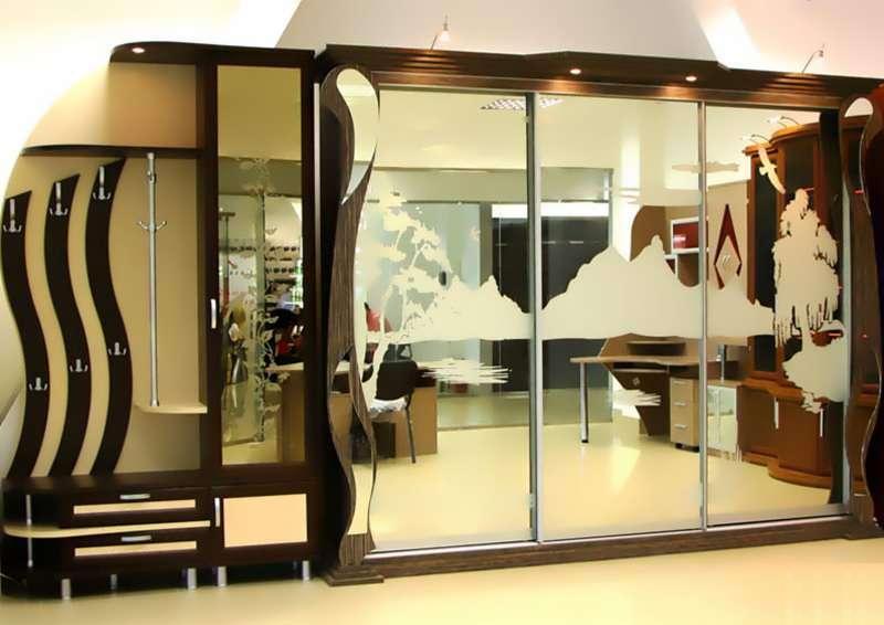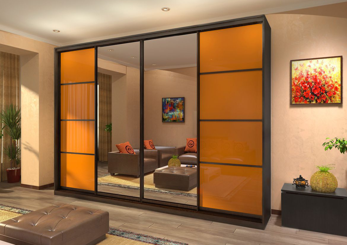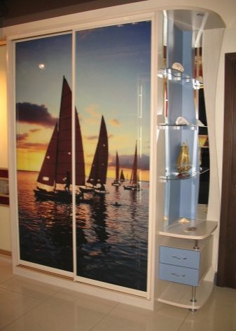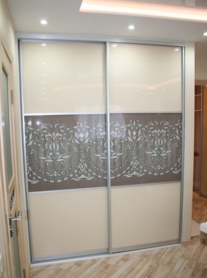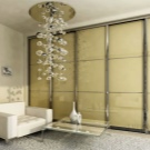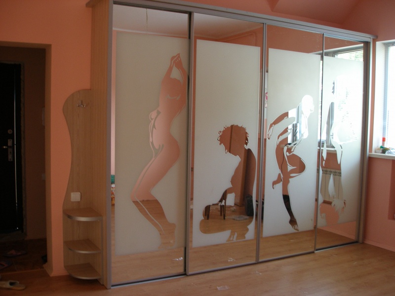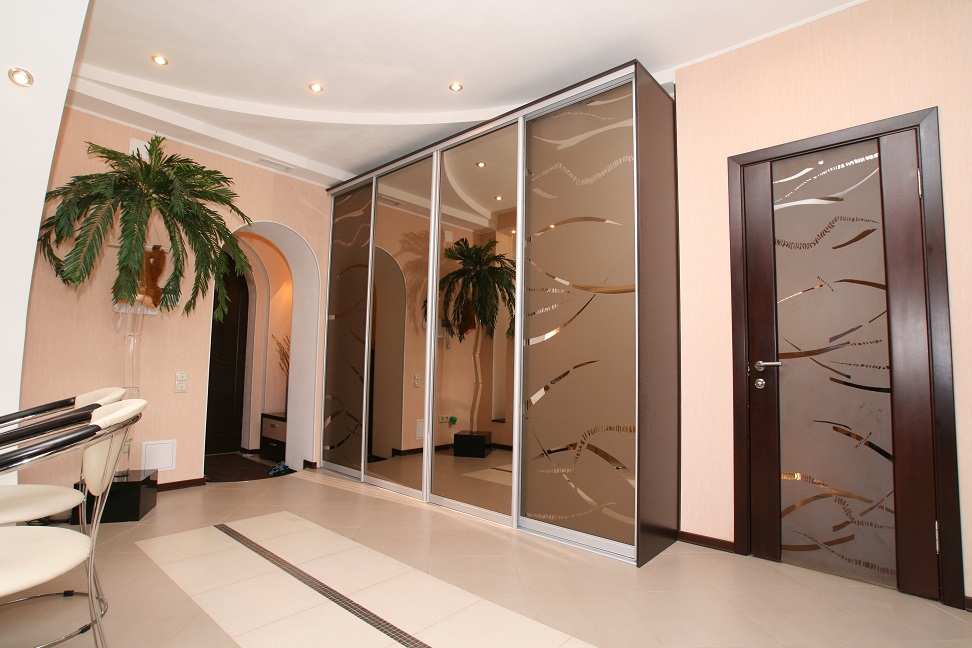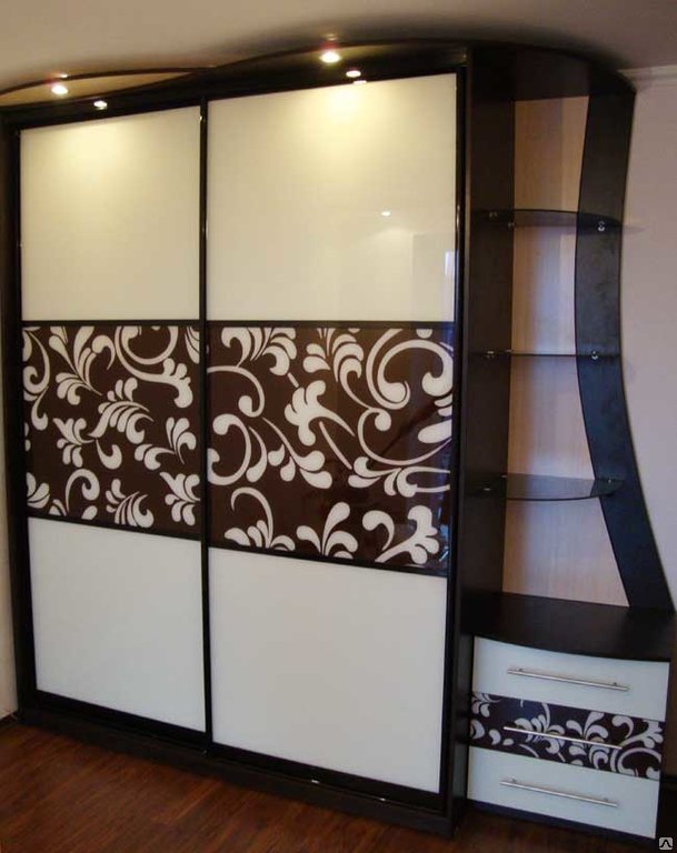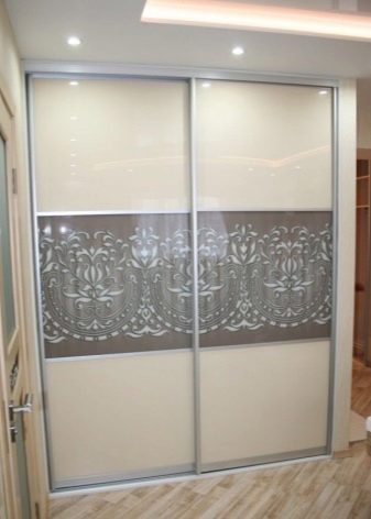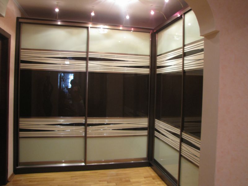 Récemment, une armoire à revêtement lacobel - en verre, peint de l’extérieur dans toutes les couleurs, est devenue particulièrement populaire. Il existe des modèles monophoniques, et également avec le dessin mis. Les façades en miroir sont également très appréciées par les consommateurs et présentent différentes variantes. Vous pouvez commander ou acheter une surface claire ou foncée, choisissez une combinaison de verre dépoli et lisse.