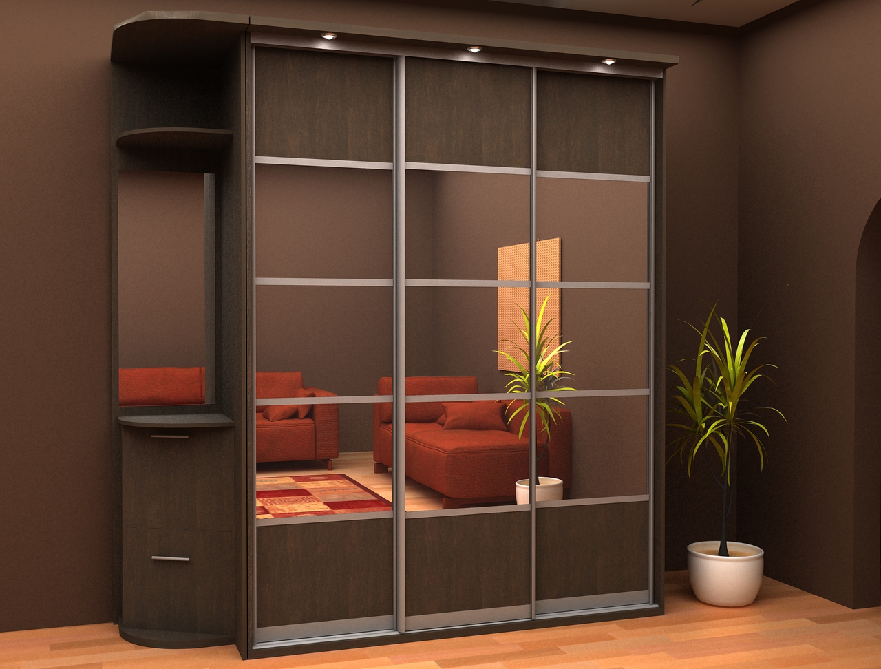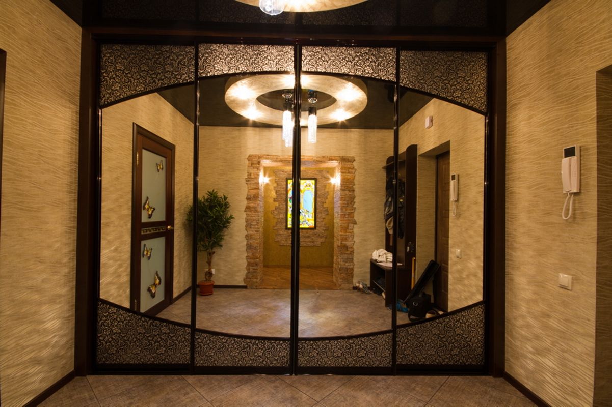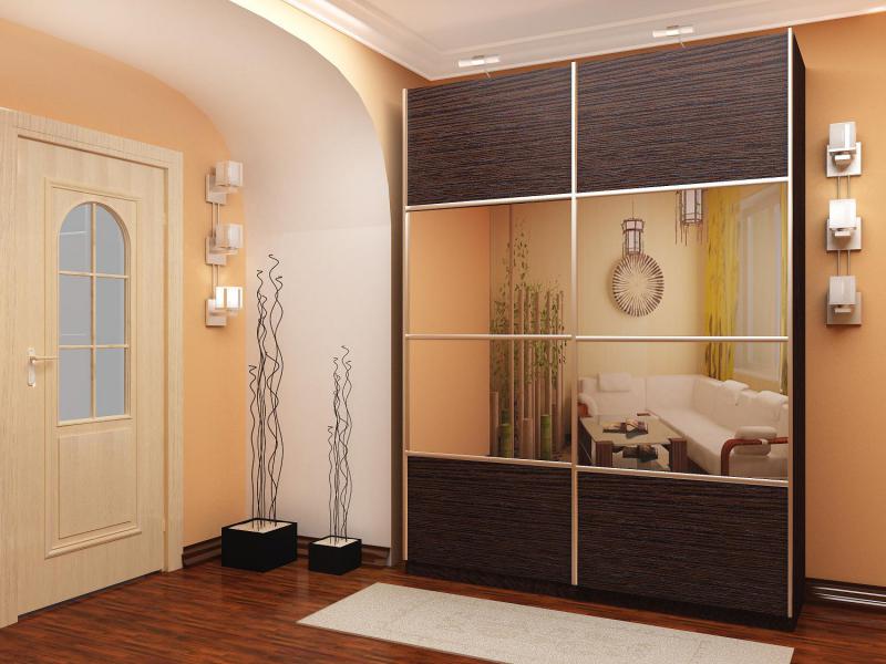 Il est préférable d’acheter une armoire pour le couloir avec au moins une porte en miroir. C'est beau, pratique et pratique (plus de lumière apparaitra, l'espace s'agrandira visuellement, l'intérieur s'améliorera, le besoin d'une commode disparaîtra). Si le miroir ne remplace qu'un seul panneau, il est souhaitable qu'il soit situé au centre. Il est préférable de ne pas installer un module entièrement miroir dans le couloir car à cet endroit, les bords des miroirs peuvent souvent subir des dommages mécaniques.