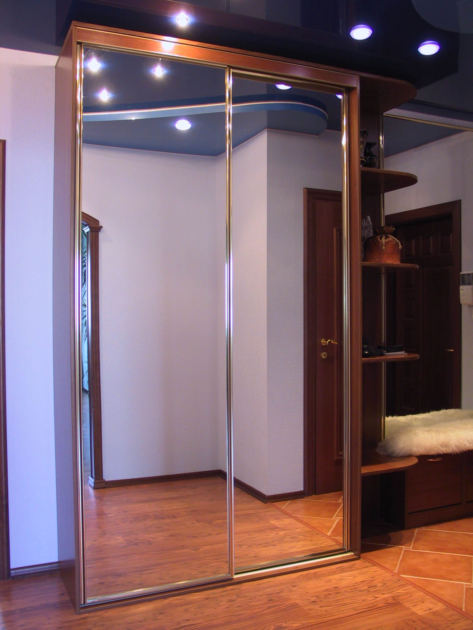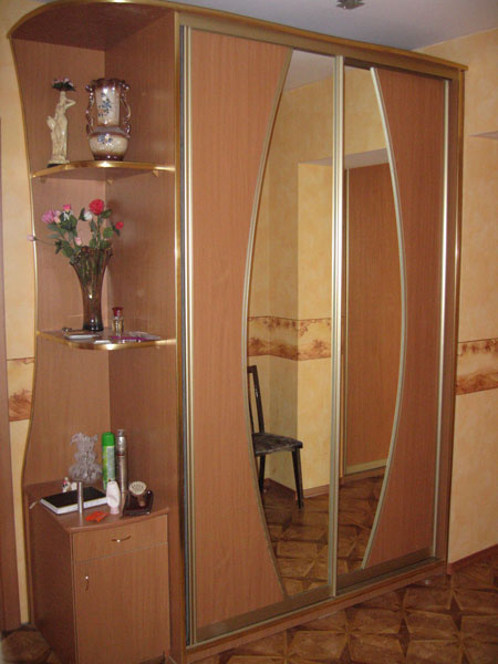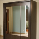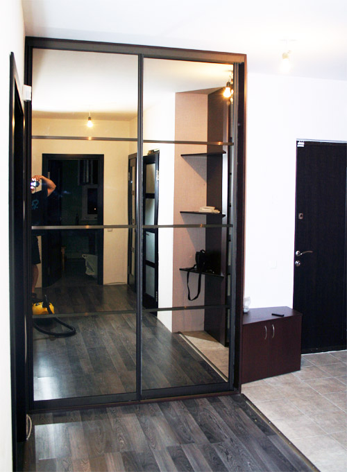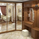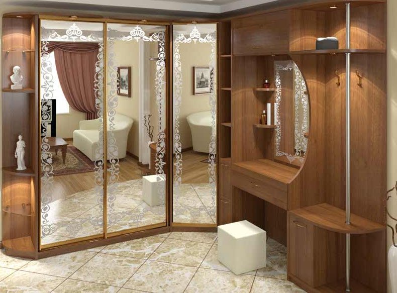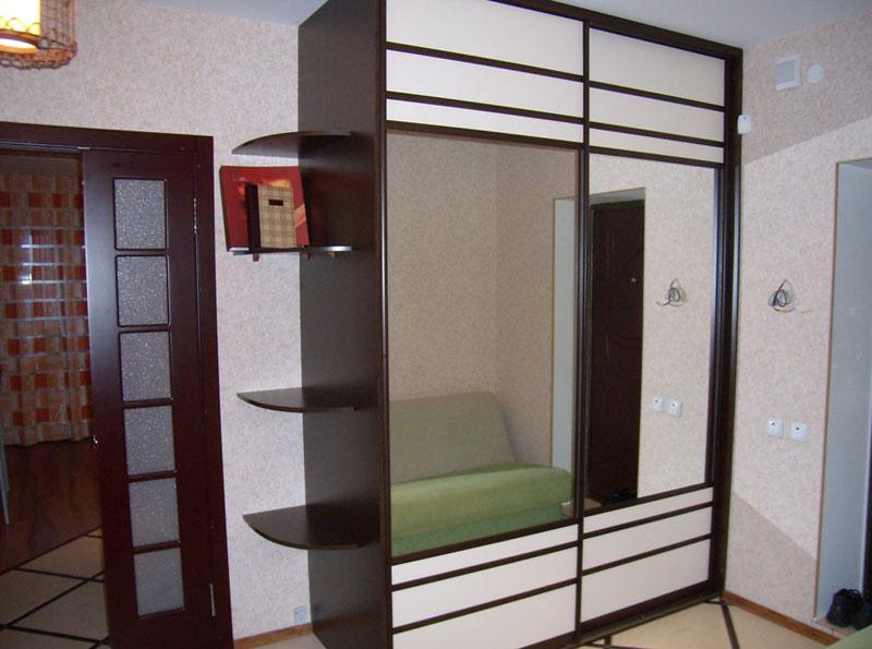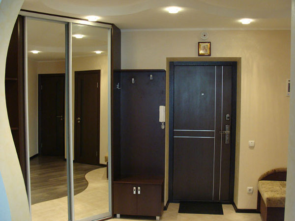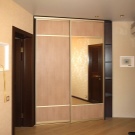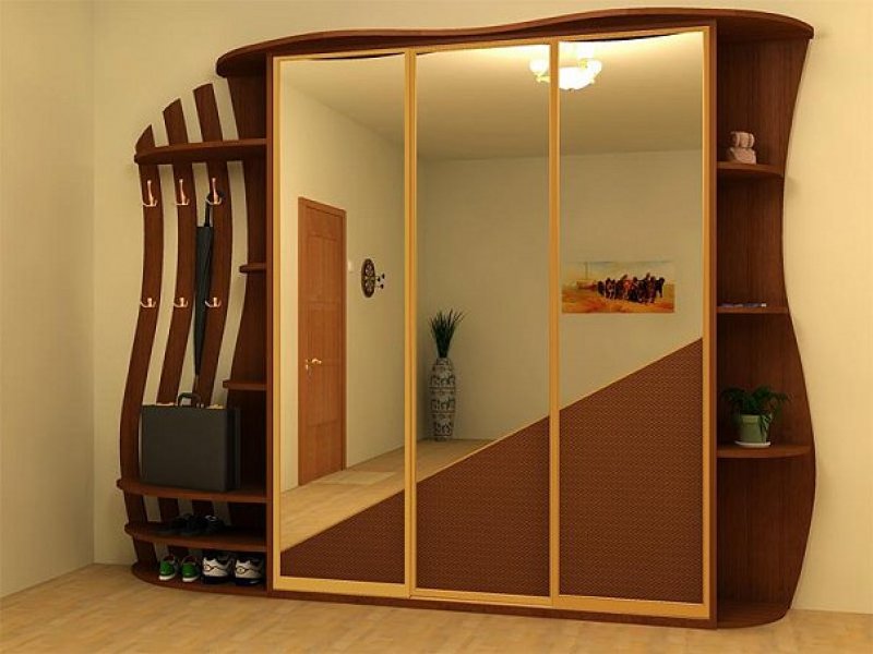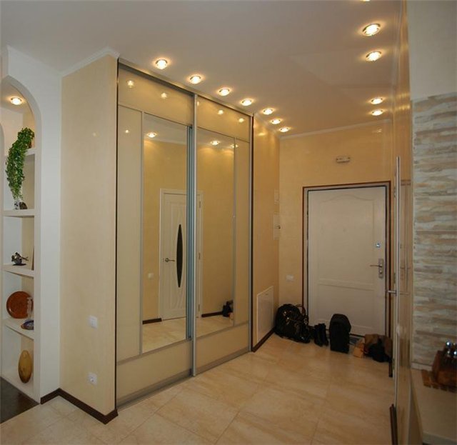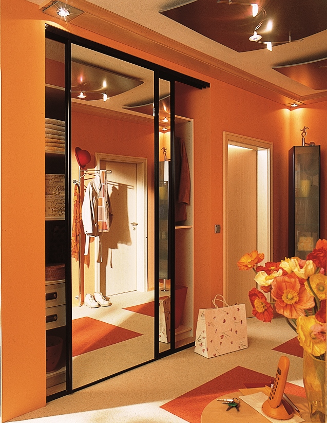 - intégrité de l'espace. Garde-robe intégrée - le modèle le plus populaire de meubles de garde-robe.Ses dimensions allant du sol au plafond agrandissent réellement la pièce, grâce au miroir de la taille de la ceinture. De plus, un espace harmonieux sans niches est créé. Un miroir dans le couloir est une nécessité pour les ménages - c'est un plus. Mais ces meubles ne peuvent pas être transférés - et ceci est un inconvénient;