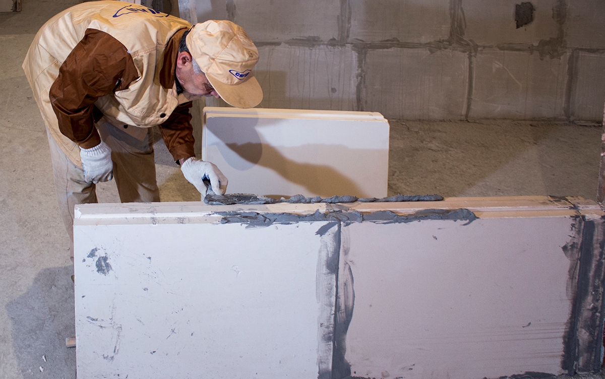 La solution de ce mastic est très pratique pour l'installation de panneaux de gypse. En cours de montage, Fugen est appliqué dans l'évidement (rainure) de la rangée inférieure de plaques et dans la rainure verticale à partir de l'extrémité. Feuille de gypse pressée fermement, le mastic de résidus dépassant enlevé. Il existe ensuite un processus similaire à la pose de briques avec du mortier de ciment.