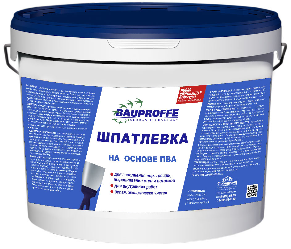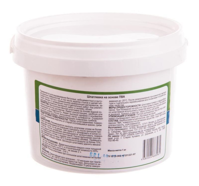 Le liant principal est l'acétate de polyvinyle, qui est également la colle PVA bien connue (GOST n ° 520-20 de 2003). Cette substance offre une forte adhésion. La craie est utilisée comme charge. On peut y ajouter du talc, car il donne une fraction fine pour créer une surface lisse sans nids de poule et bulles.