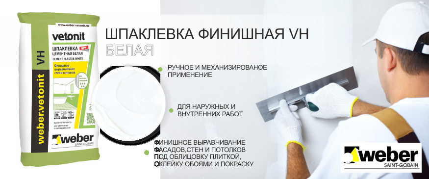 - Mastic résistant à l'humidité Weber. Vetonit VH parfait pour les travaux extérieurs et intérieurs. Facile à appliquer sur du béton et du béton mousse. La pâte empêche l’apparition de condensation sur le plafond, elle est donc largement utilisée dans les zones humides. De plus, le fabricant Weber propose pour toute une gamme de travaux de décoration, un jointoiement de carreaux de différentes nuances sur une base de ciment.