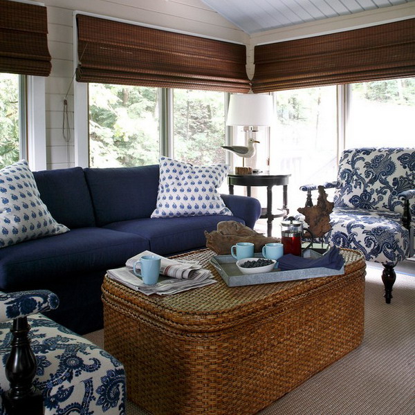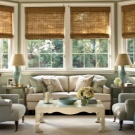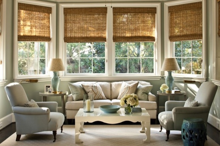 - Rideau de bambou très élégant ressemble à une fenêtre en treillis. L'intérieur de la véranda est entièrement conçu dans des tons beiges naturels. Selon le style, l'intérieur ressemble à celui de la Provence ou de la campagne: étagères ouvertes, couleurs vives, robinetterie complexe. L'obturateur est lâche, il diffuse des rayons directs, permettant à la pièce de rester lumineuse.