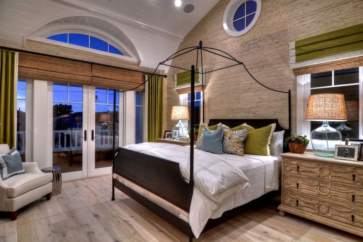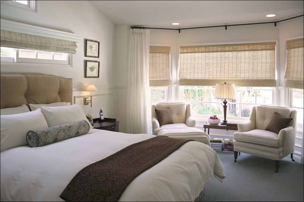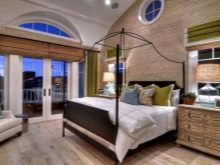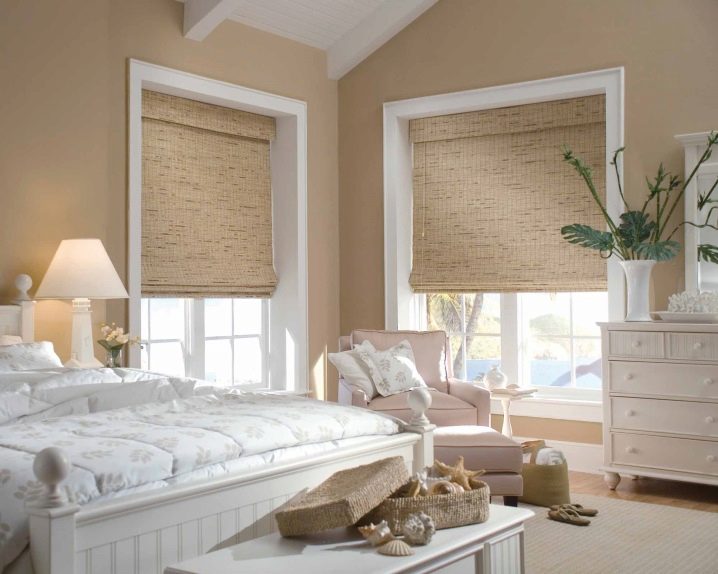 - Les grands rideaux de bambou de la taille d'une fenêtre auront fière allure dans une chambre à coucher lumineuse et classique. Ici, pour les soutenir, un panier en osier et des coquilles décoratives ont été ajoutés à l'intérieur - un soupçon de repos dans un «paradis». Les murs beiges monochromes sont également en parfaite harmonie avec les rideaux.