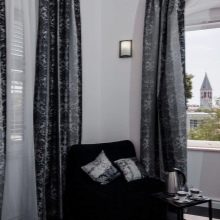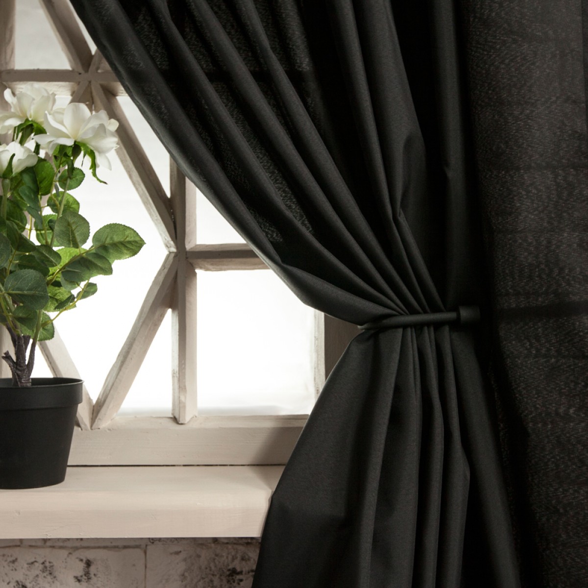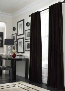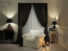 Les concepteurs recommandent vivement l’utilisation de rideaux noirs, qu’il s’agisse d’options simples, avec dessin ou combiné avec d'autres couleurs uniquement dans les grandes et spacieuses pièces. Si vous avez décidé de concevoir des fenêtres dans des rideaux sombres sur la base d'une petite pièce, il est fortement recommandé de choisir des modèles courts et simples qui couvrent la fenêtre jusqu'au seuil. La quantité de noir dans la pièce ne doit pas dépasser 10% de toutes les autres couleurs.