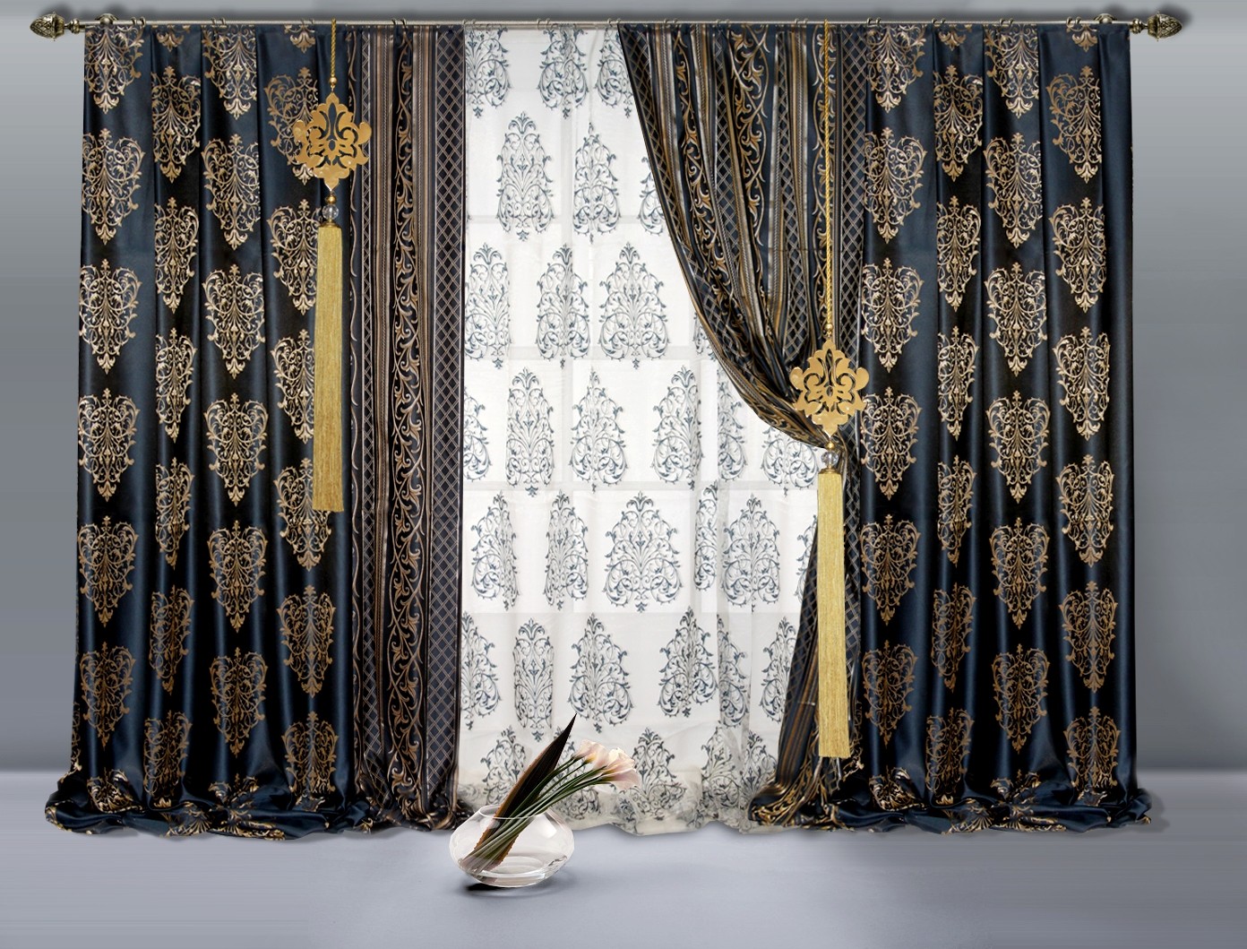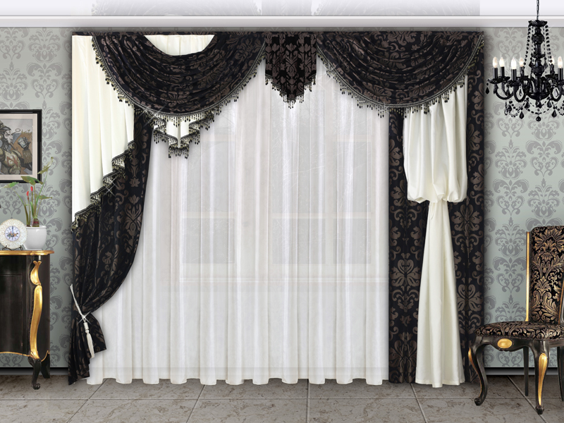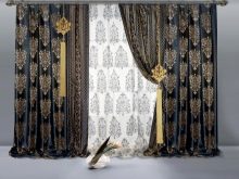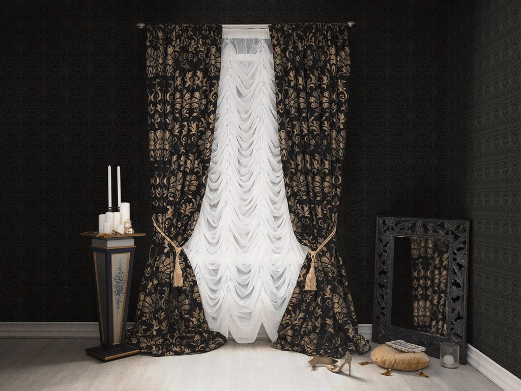 - D'or Golden en combinaison avec le noir est souvent utilisé pour les styles classiques dans lesquels ils ne sont pas liés à des éléments décoratifs. Le duo de ces deux couleurs peut être trouvé lors du choix des rideaux. Il est à noter que ces modèles ont une apparence spécifique. Look plus moderne, modèles noirs avec de l'or, où la couleur supplémentaire apparaît sous la forme de grands ou de petits motifs.Les rideaux luxuriants avec des lambrequins sont considérés comme le design spectaculaire des fenêtres de style baroque ou rococo.