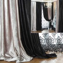 Le matériau du rideau doit être serré. Le tulle léger, l'organza ou la soie légère ne conviennent pas aux décors gothiques. La meilleure option est le velours ou le drapé. Quant à la longueur, il devrait être un modèle dans le sol, pas d'options raccourcies et miniatures.