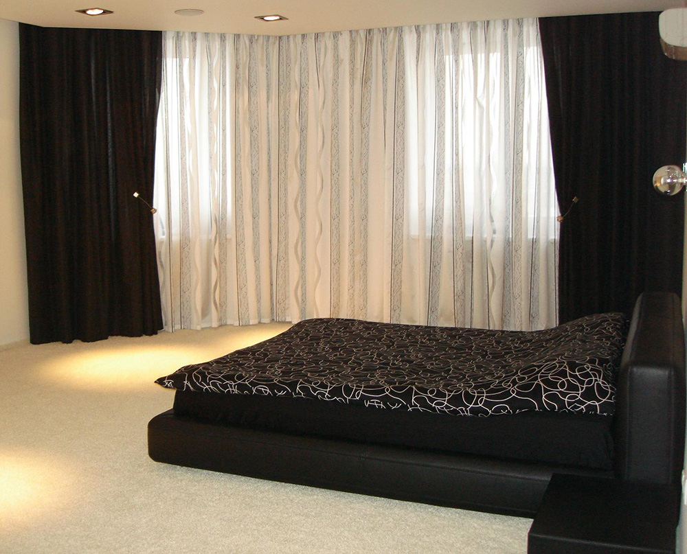 Dans la chambre à coucher, vous pouvez placer des rideaux occultants. Ils ne permettront pas au soleil levant de vous réveiller à l'aube.Vous pouvez également choisir un rideau de type romain. Si vous le souhaitez, ils peuvent être combinés avec des rideaux coulissants. Le motif sur les rideaux est souhaitable pour choisir un dimafin qu'il n'irrite pas les yeux. Avec l'aide de rideaux noirs, vous vous sentirez seul.