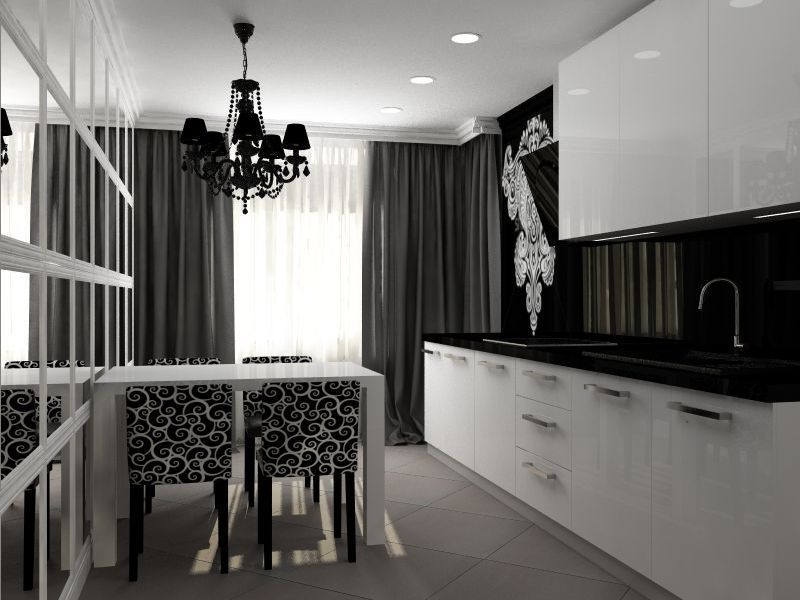 Les concepteurs sont priés d'abandonner l'idée de suspendre de tels rideaux dans la cuisine. C’est la salle à manger et les conversations amicales autour de la table, qui devraient régner sur des teintes douces et délicates. Stylistes permettre l'utilisation de rideaux noirs et rouges. Les stores enrouleurs pratiques et abordables sont parfaits pour cette pièce.