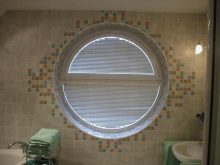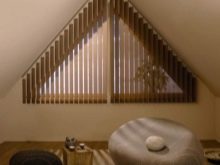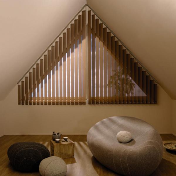 Les fenêtres trapézoïdales, rondes et triangulaires sont décorées avec des stores sur un rebord flexible.