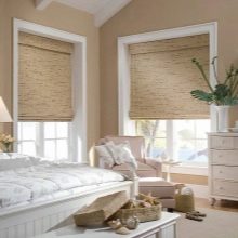 - Pour la chambre Il est important d’utiliser des volets roulants, des stores horizontaux et verticaux, des occultations de lumière en combinaison avec du tulle à air. Cela donnera l'occasion de laisser beaucoup de lumière dans la pièce pendant le jour et d'assombrir complètement la chambre la nuit.