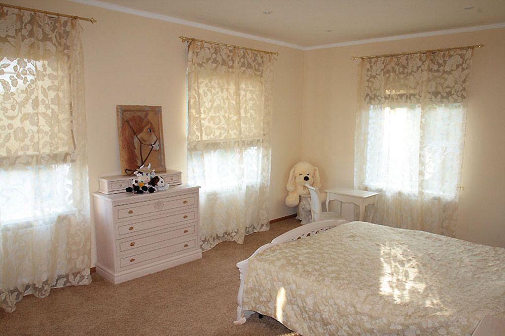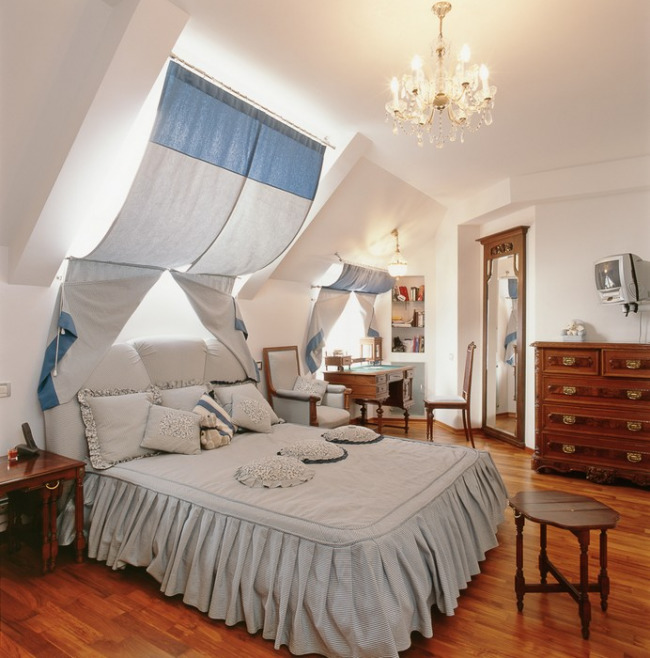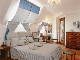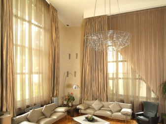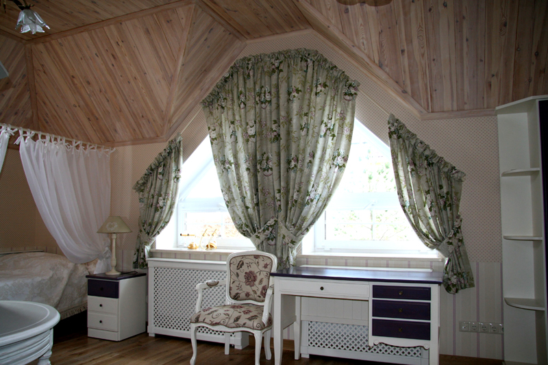 Les possibilités de design des rideaux dans une maison privée ou un chalet sont souvent beaucoup plus larges que dans un appartement avec une configuration standard. Ici vous pouvez rencontrer et grenier avec puits de lumière, et d'énormes salles de séjour, où les fenêtres de deux à cinq, et sorties sur le balcon de la chambre.